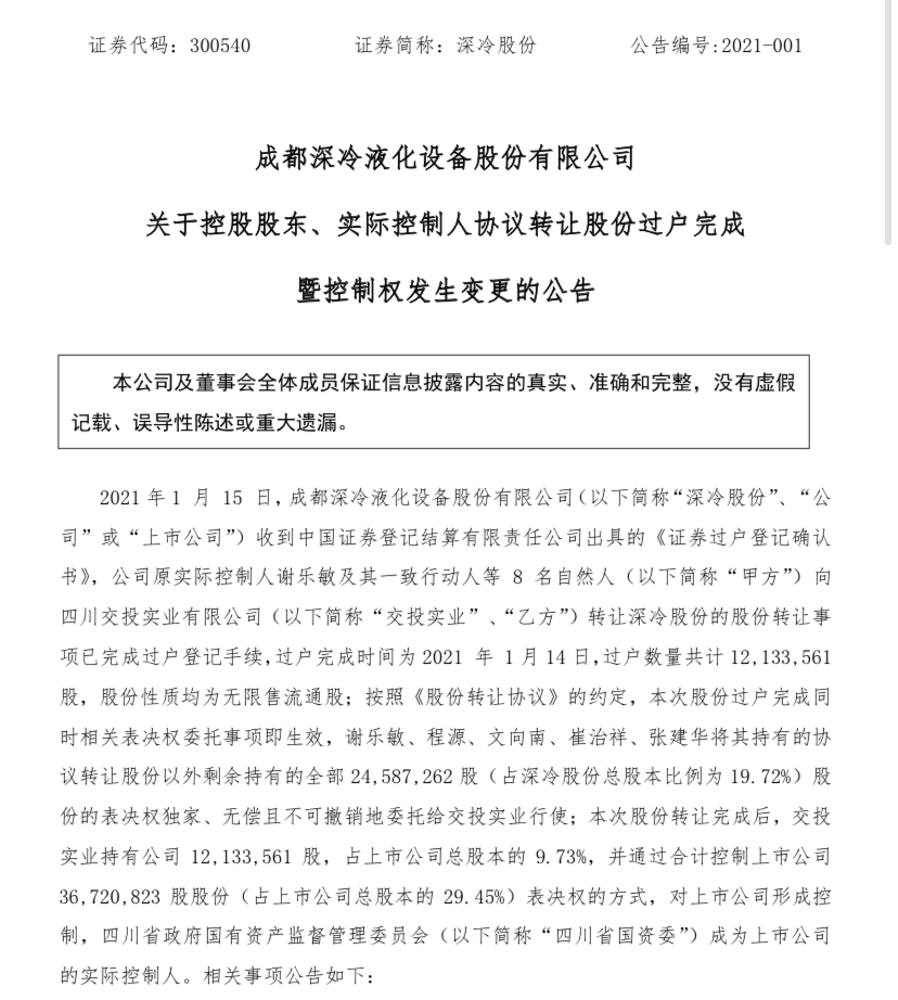 1月15日晚间,深冷股份发布公告,公司收到中国证券登记结算有限责任公司出具的《证券过户登记确认书》,公司原实际控制人谢乐敏及其一致行动人等8名自然人(“甲方”)向四川交投实业有限公司(“交投实业”、“乙方”)转让深冷股份的股份转让事项已完成过户登记手续,过户完成时间为2021年1月14日,过户数量共计1213.36万股。