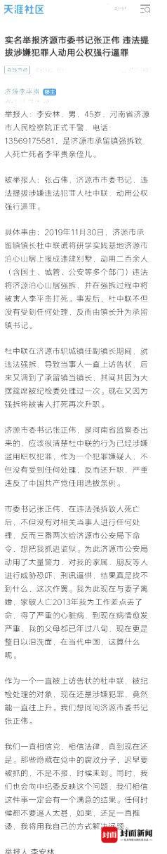 1月18日16时50分,天涯社区的百姓声音板块,网帖名为《实名举报济源市委书记张战伟违法提拔涉嫌犯罪人动用公权强行逼罪》,发帖者自称为河南省济源市检察院正式干警李安林。实名举报贴再度将张战伟书记作为其实名举报的对象,此帖迅速引起广泛关注。而此前,“济源市尚娟”微博实名举报济源市委书记张战伟“掌掴”自己的丈夫、济源市政府秘书长翟WD。