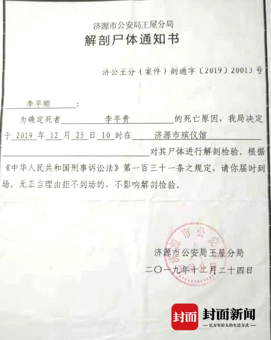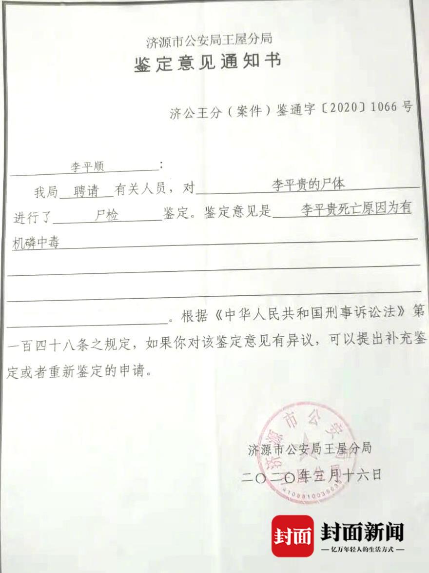 2020年3月16日,济源市公安局王屋分局出具的《鉴定意见书》:“李平贵死亡原因为有机磷中毒。”对于公安部门的尸检报告,李平贵家属不予认可。之后,李安林提出了重新鉴定申请,2020年4月1日,济源市公安局以“不符合重新鉴定情形为由”,最终出具了不予重新鉴定的告知书。