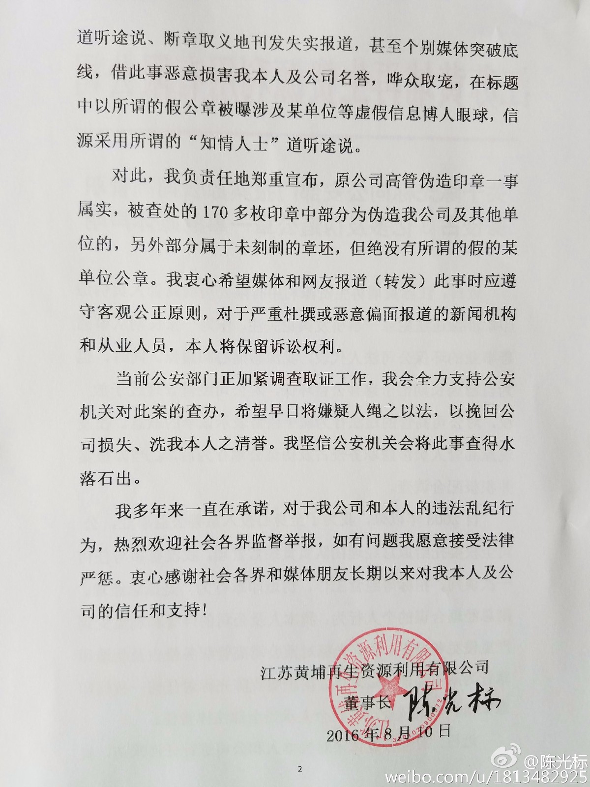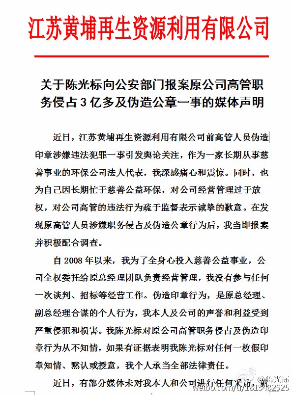 近日,有媒体报道南京警方从陈光标担任法人代表的江苏黄埔再生资源利用有限公司内搜出170余枚涉嫌伪造公章一事。10日,陈光标在其微博发布《关于陈光标向公安部门报案原公司高管职务侵占3亿多及伪造公章一事的媒体声明》。称“如果有证据表明我陈光标对任何一枚假印章知情、默认或授权,我个人承当全部法律责任。”