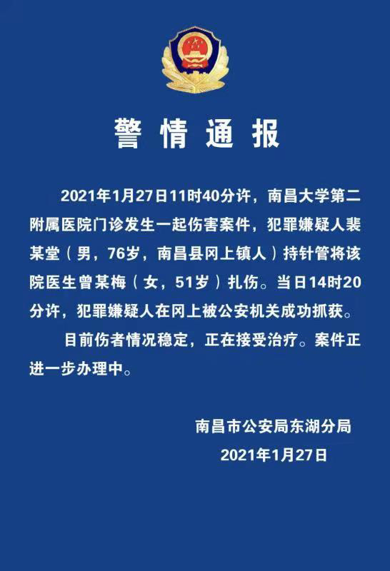 1月27日下午,负责此案的南昌市公安局东湖分局,也发布了相关通报,通报称,该事件发生在1月27日上午11时40分左右,嫌疑人裴某堂(男,76岁,南昌县冈上镇人)持针管扎伤了南昌大学第二附属医院的医护人员曾某梅(女,51岁)。裴某堂也于1月27日下午2时20分左右,被警方控制。同时,警方表示,伤者情况稳定,正在接受治疗。