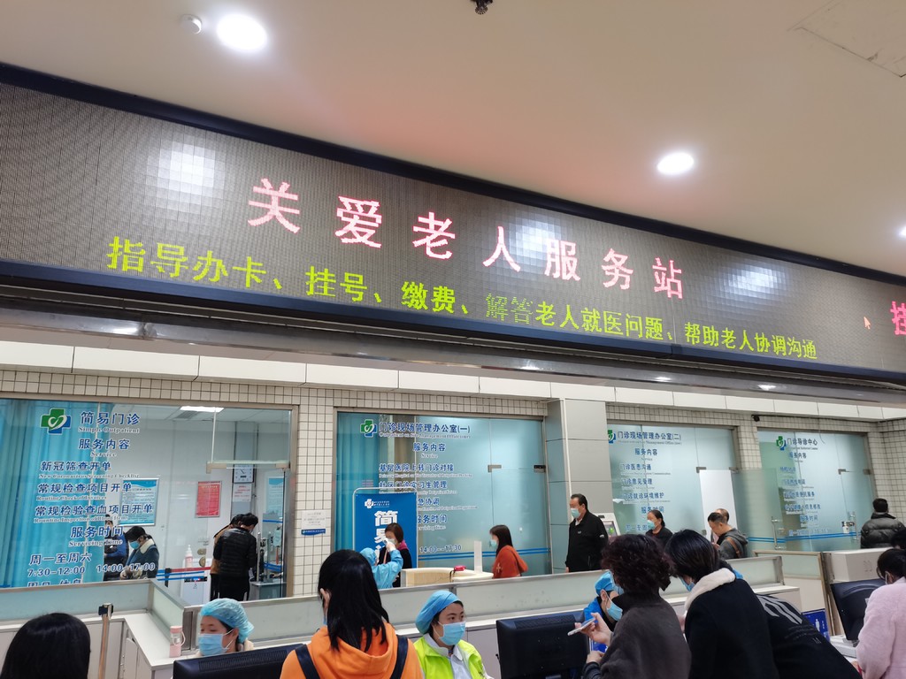 1月25日,四川省人民医院“关爱老人服务站”人头攒动,不少银发患者在工作人员指导下挂号。因疫情取消现场挂号窗口后,医院便开辟了这个服务站。