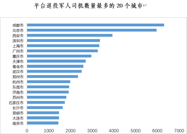报告还指出目前,滴滴平台退役军人主要分布在东南沿海和西南地区。其中,广东省参与平台新就业的退役军人司机最多,其次是山东、浙江、江苏和四川等省份。与此同时,退役军人司机多选择在直辖市、省会城市或省内经济发达的城市就业,成都的退役军人司机超过6000名,位列全国第一,北京、西安、深圳以及上海的退役军人司机数量依次排在2-5位。