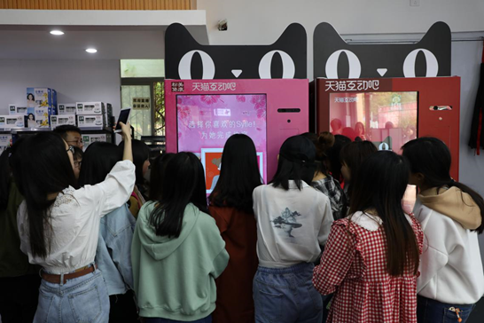中午12点正值学生下课,天猫校园店涌进了川流不息的大学生,选购商品,体验自助结算,天猫互动吧派样机、天猫魔镜吸引了众多女大学生。