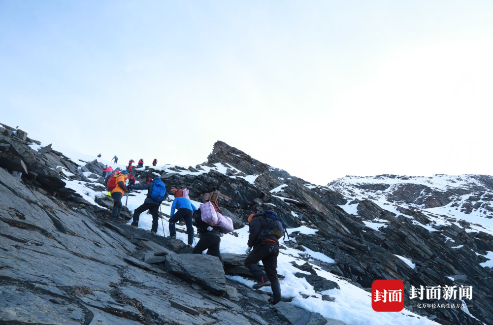 9日第一个到大本营的周鹏,此刻感到了些许难度,“周围一片漆黑,我们踏着尽是泥泞和积雪的道路前行,”周鹏坦言有些害怕,然而更大的挑战在后面,路过大槽之后,眼前是一幕巨大的岩壁,所有人必须徒手攀爬,“角度差不多有45°,”爬过岩壁后,太阳已经在慢慢升起,阳光照在雪坡上,格外耀眼。