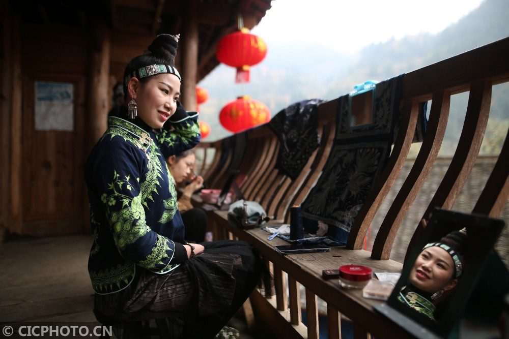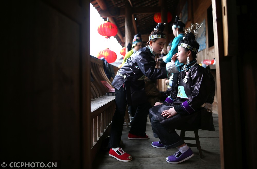 ↑在贵州省丹寨县扬武镇争光村,苗族村民在妆扮准备参加演出。CICPHOTO/黄晓海 摄