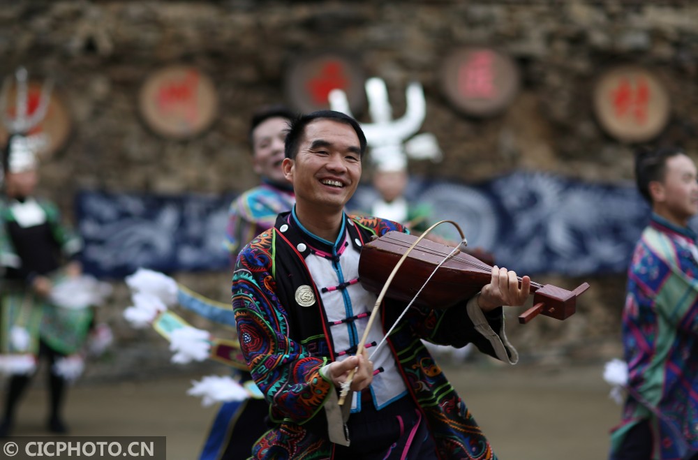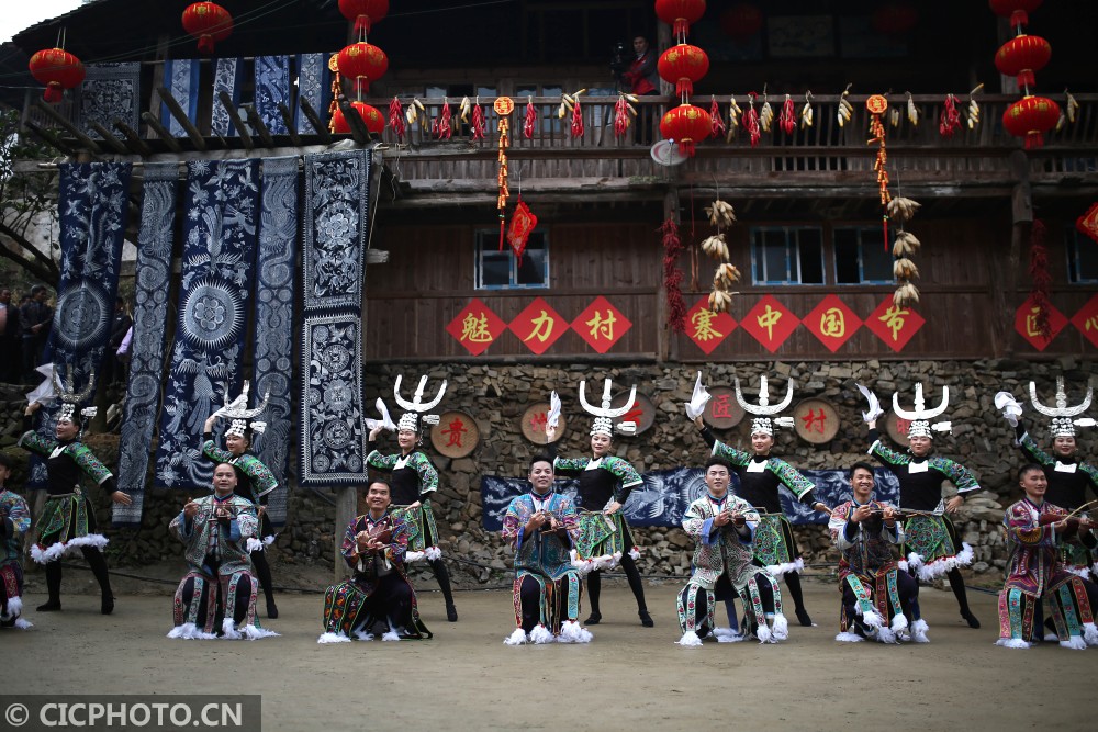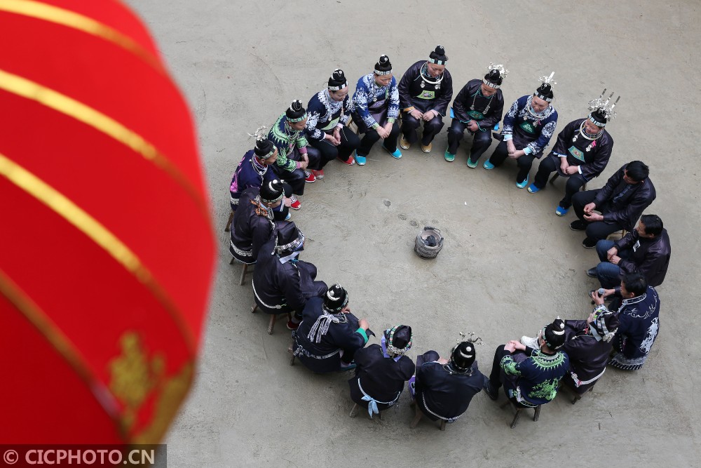 ↑在贵州省丹寨县扬武镇争光村,苗族村民在表演传统苗族古歌。CICPHOTO/黄晓海 摄