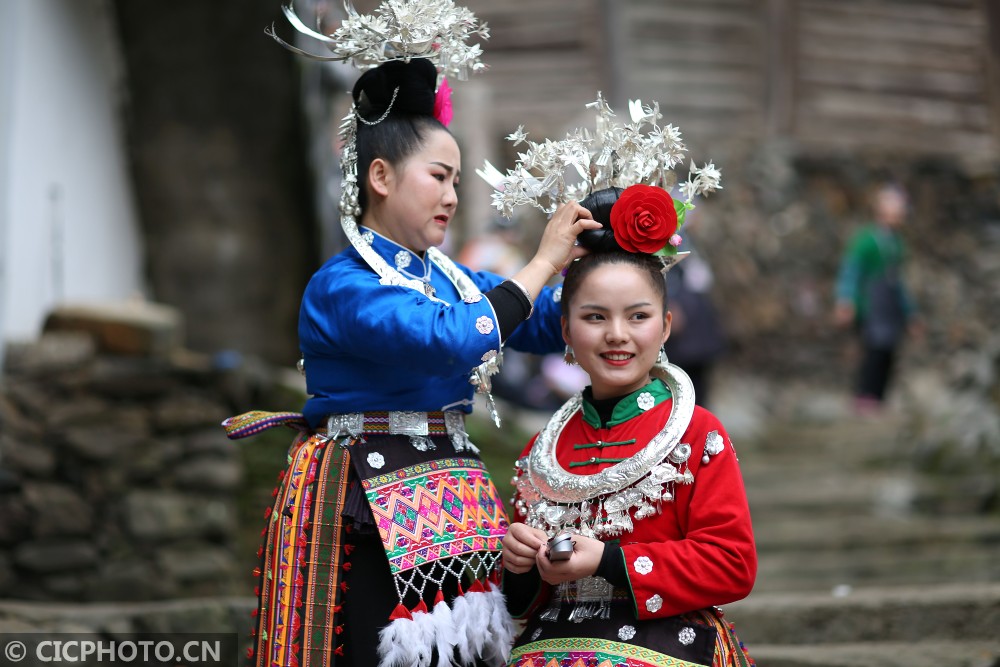 ↑在贵州省丹寨县扬武镇争光村,苗族村民在整理盛装。CICPHOTO/黄晓海 摄
