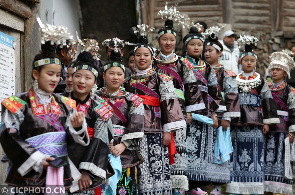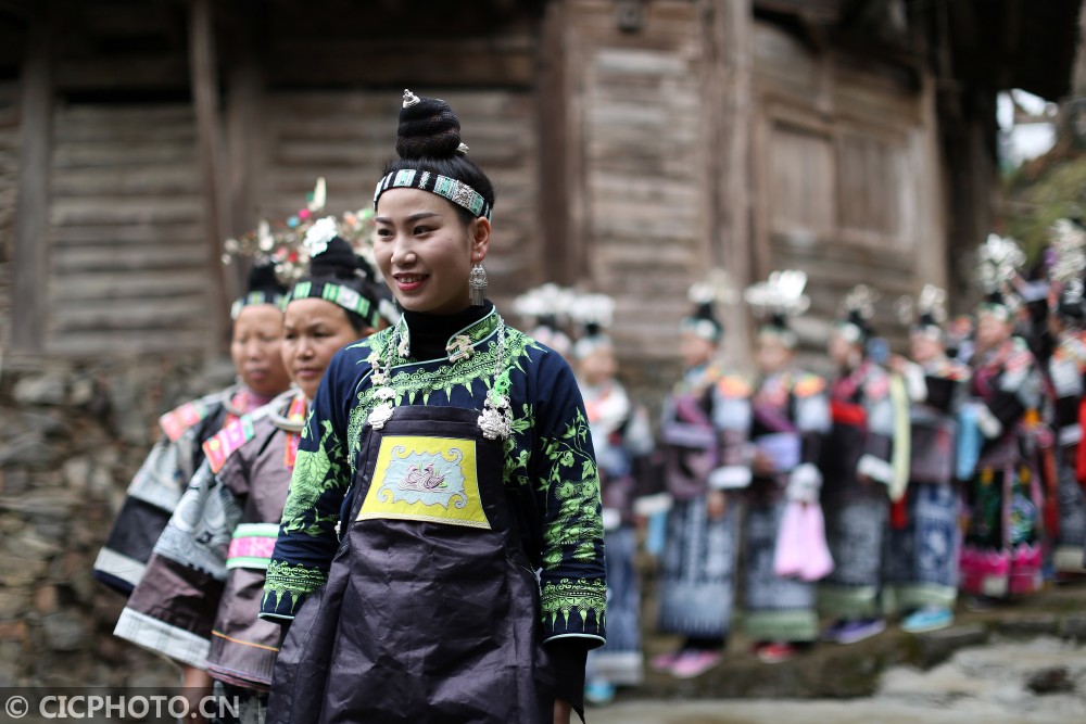 ↑在贵州省丹寨县扬武镇争光村,盛装打扮的苗族村民在等待演出。CICPHOTO/黄晓海 摄