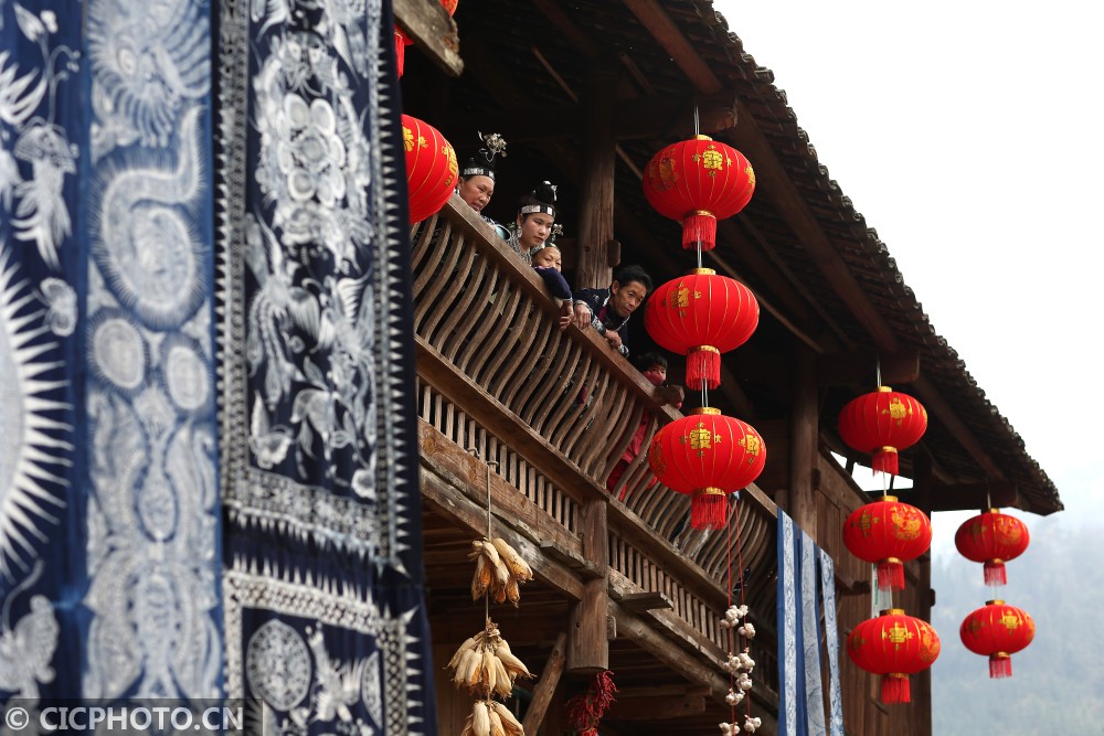 ↑在贵州省丹寨县扬武镇争光村,苗族村民在观看表演。CICPHOTO/黄晓海 摄