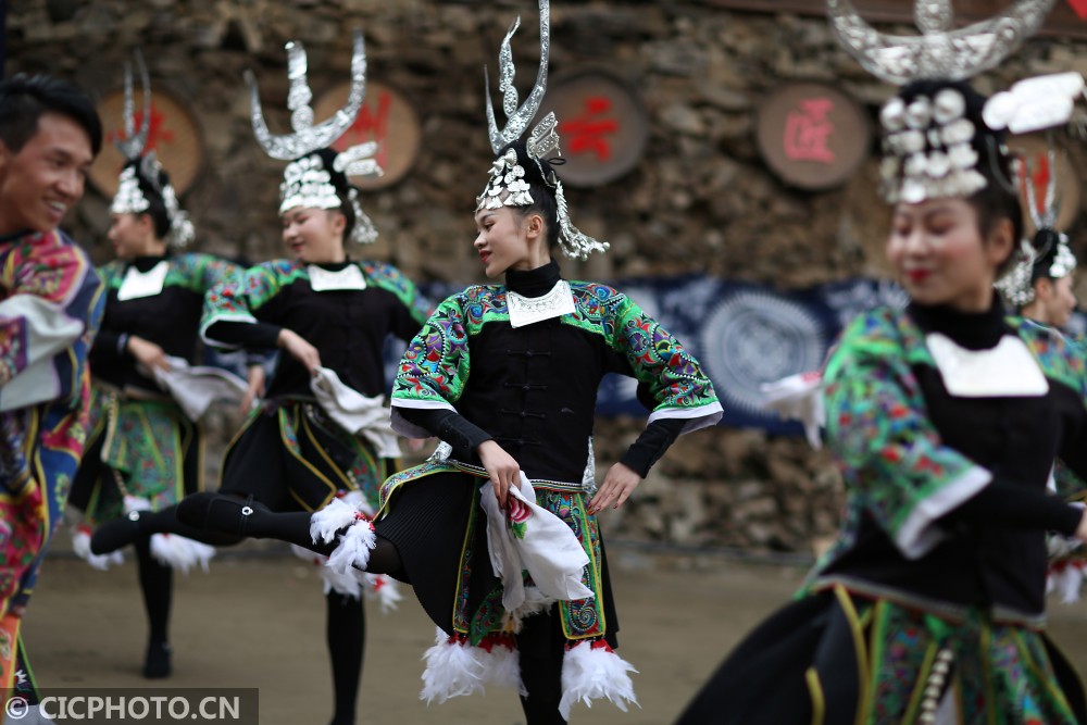 ↑在贵州省丹寨县扬武镇争光村,文化志愿者在表演苗族古瓢舞。CICPHOTO/黄晓海 摄