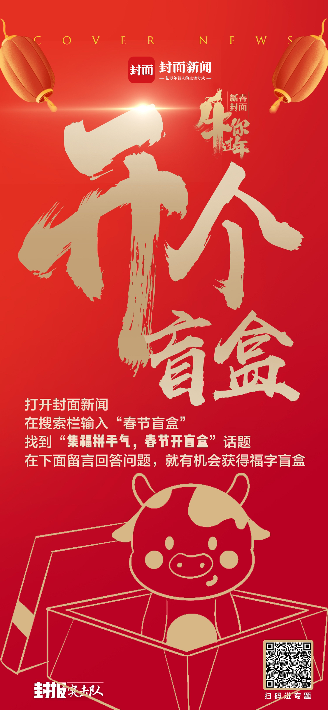 打开封面新闻APP,搜索“春节开盲盒”,进入#集福拼手气,春节开盲盒#话题。在官方账号“一条锦鲤”的问题贴下留下你的答案,就有机会抽中福字“盲盒”哦!