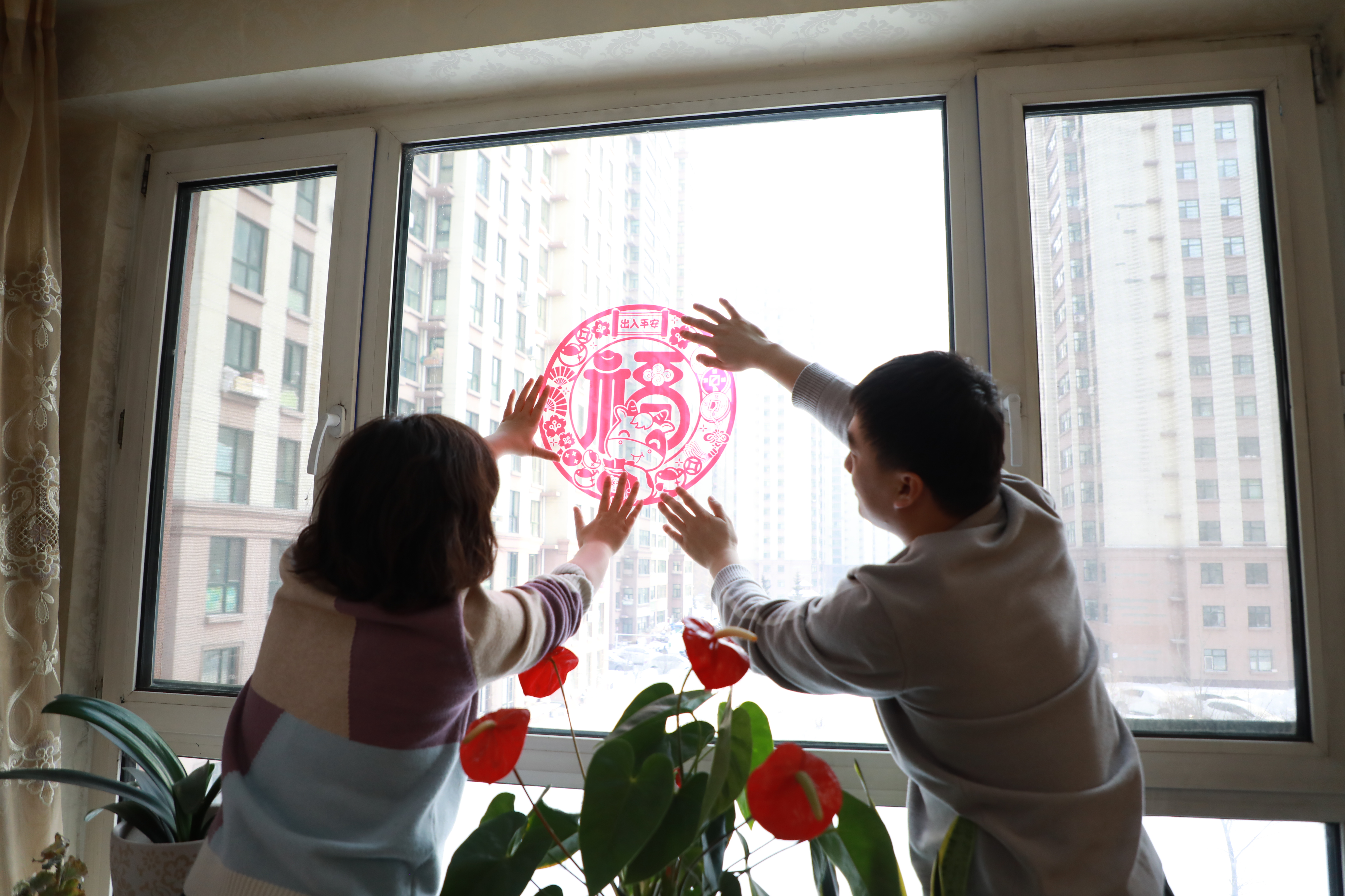 贾明平(左)和丈夫高吉祥(右)在家贴窗花布置室内准备迎接春节(牡丹江客运段供图)