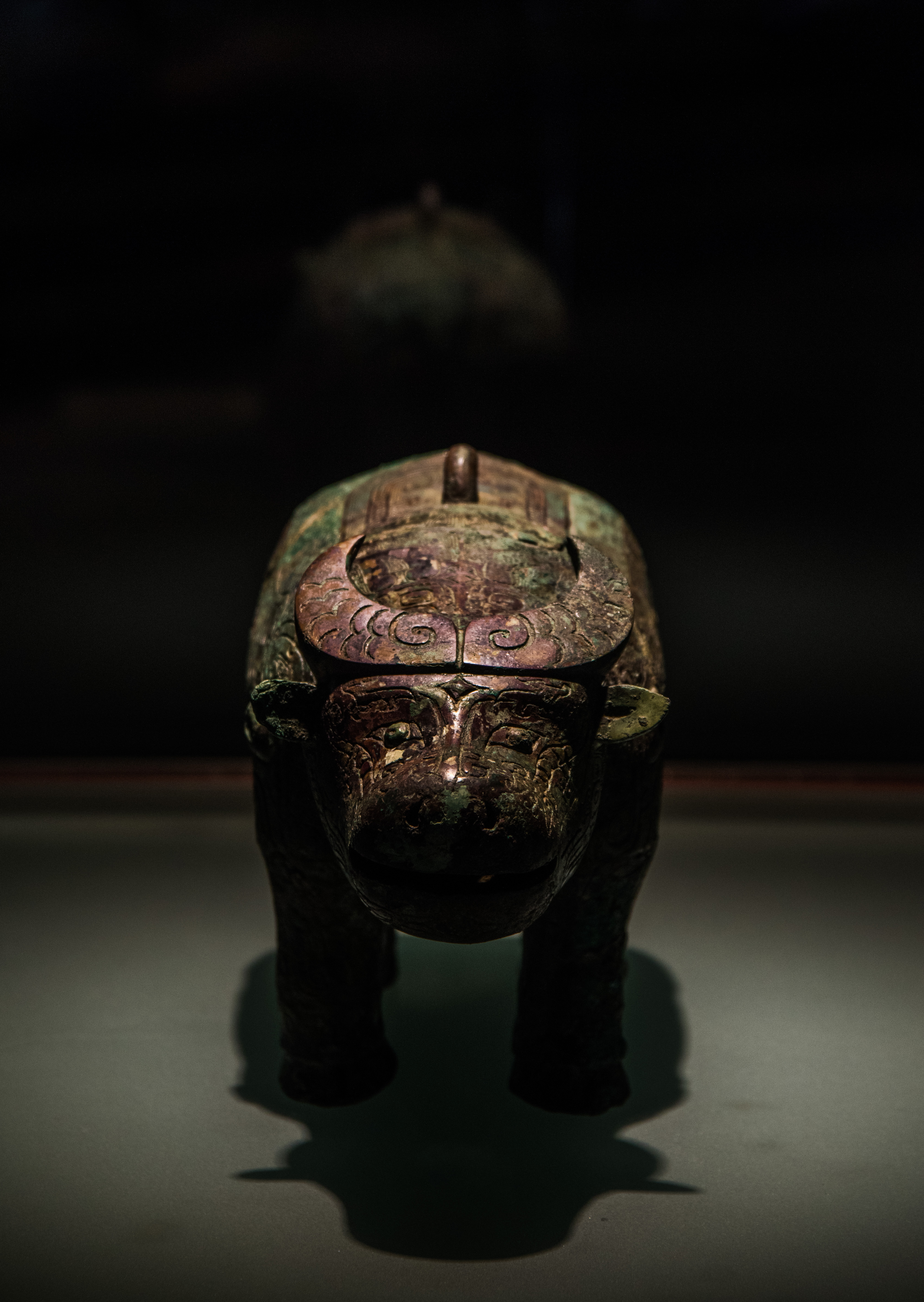 现藏于殷墟博物馆的亚长牛尊,在灯光下泛着幽幽青光,只见牛角弯曲有力,四足粗短壮实,牛头前伸,双目大睁,牛口微张,一看就不好惹。