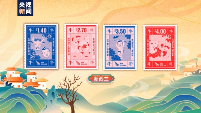 地处大洋洲的新西兰邮政发行的生肖邮票,包含一套四枚农历生肖牛年邮票和一枚小全张。这套生肖邮票具有浓郁的中国年画风格,四枚邮票中,两枚为红色,两枚为蓝色,以经典的年画娃娃与牛为元素,创作了四个不同场景。色彩红蓝相间,犹如一组“中国年画”,象征着幸福、财富、自由与和平。