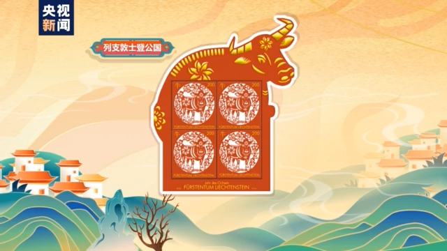 列支敦士登公国邮政发行的牛年邮票以象征好运的中国红为底色,整版呈金牛状,烘托出喜迎新春的气氛。邮票上的剪纸生肖牛眺望前方,周围环绕着盛开的鲜花,似乎在祈盼来年风调雨顺。