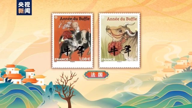 法国邮政发行的农历辛丑牛年邮票含两张小型张。绿色邮票上绘有一个手持梅花的男童,骑在一头戴着大红花的大公牛背上;而另一张则绘有一头昂首挺胸的大公牛,精气神十足。