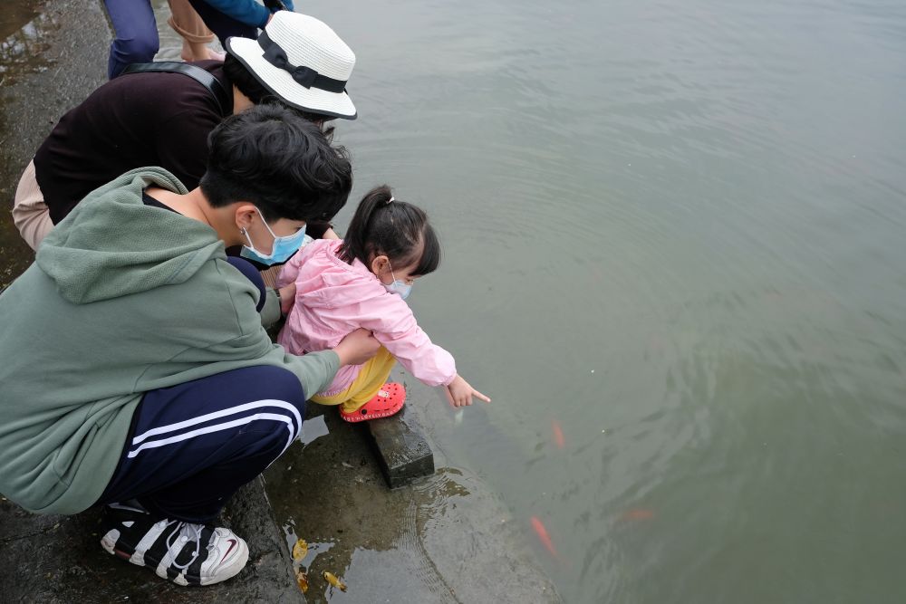 ↑人们在河内的湖中放生红鲤鱼
