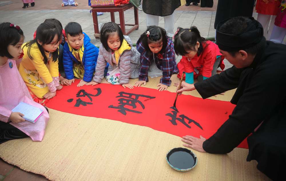 ↑一对父子在越南河内文庙观看购买的字帖。
