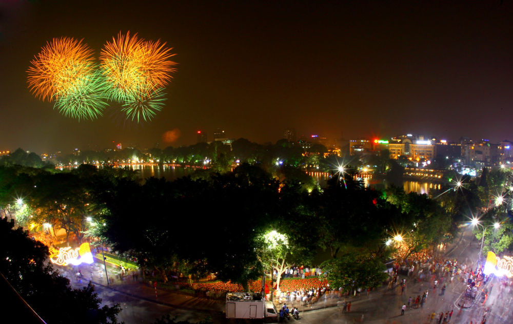 ↑在河内,人们在除夕夜观看还剑湖畔的焰火。