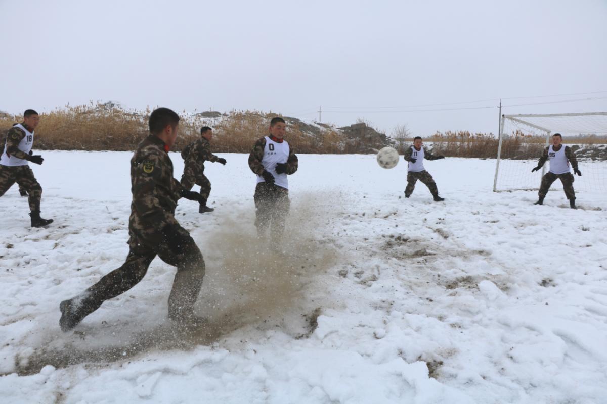 2月16日,武警兵团总队执勤第五支队组织官兵开展雪地足球比赛。黄超 摄