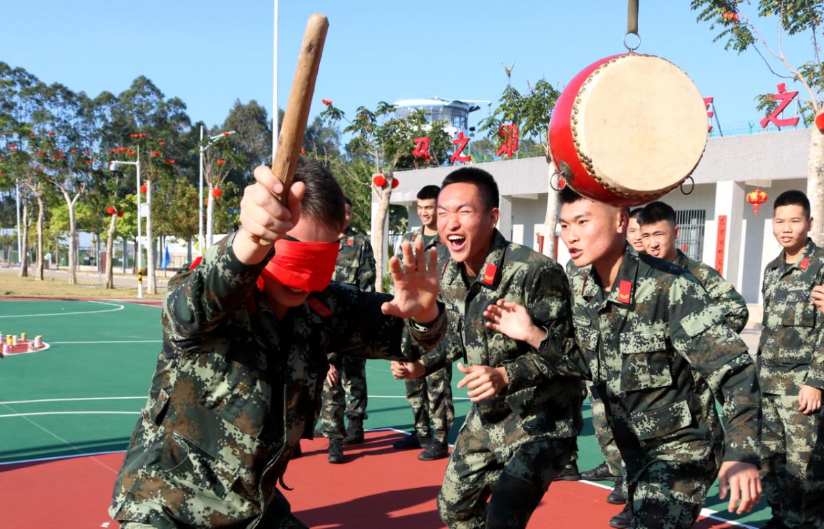 2月12日,武警海南总队三亚支队官兵在游园活动中组织“盲人敲鼓”游戏。周奕 摄