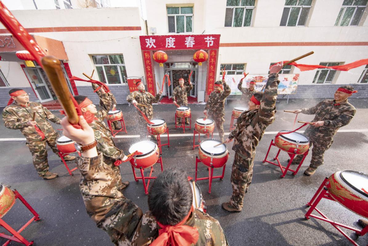 2月12日,武警新疆总队某支队组织官兵打响强军战鼓,欢度春节。余博 摄