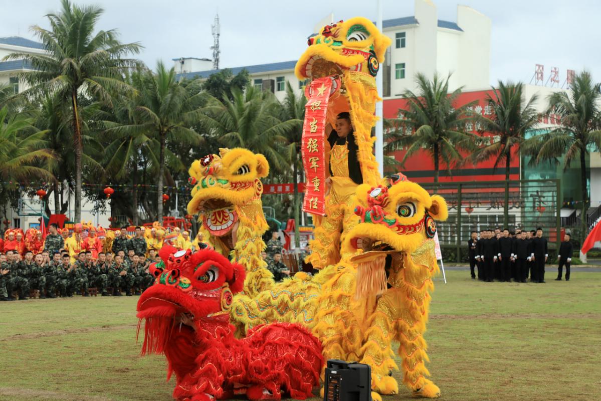 2月13日,武警海南总队机动支队官兵在“一队一品”特色文化活动展示中进行舞狮表演。雷辙 摄