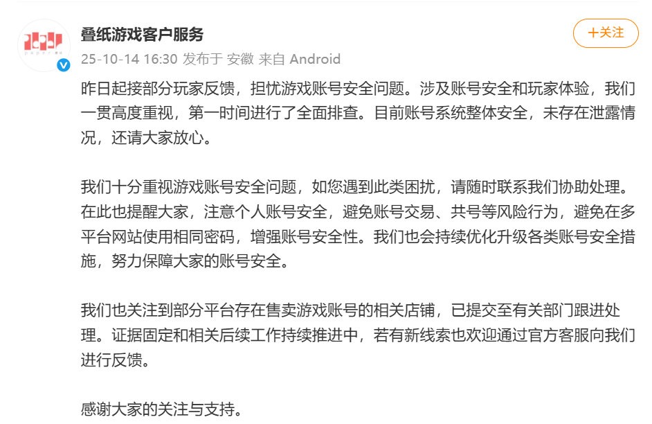 对此,叠纸方面表示,公司十分重视游戏账号安全问题,如玩家遇到此类困扰,可随时联系其协助处理,并承诺会持续优化升级各类账号安全措施,努力保障大家的账号安全。