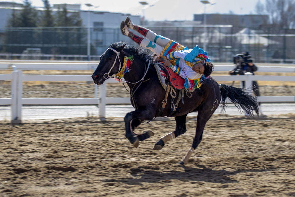 3月2日,马术队员在表演传统马术项目捡哈达。 新华社记者 晋美多吉 摄