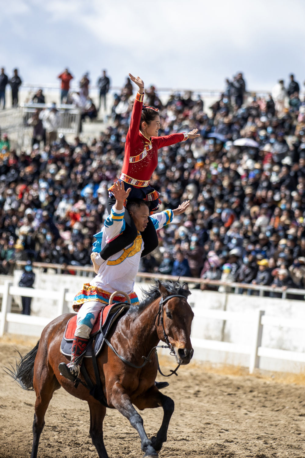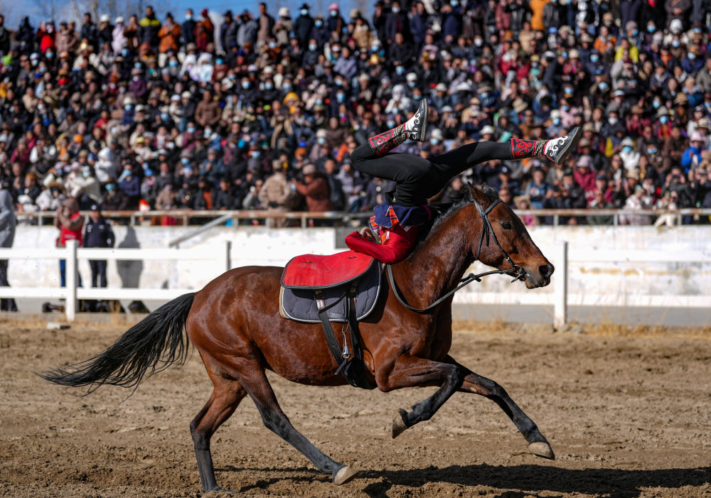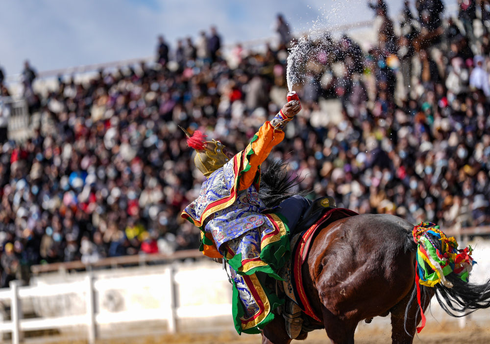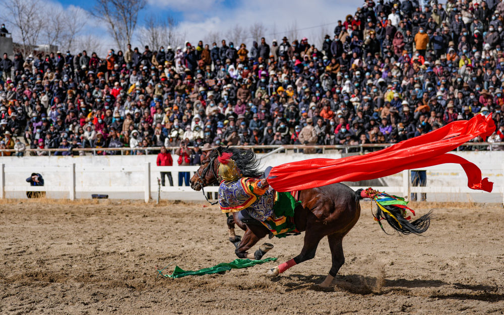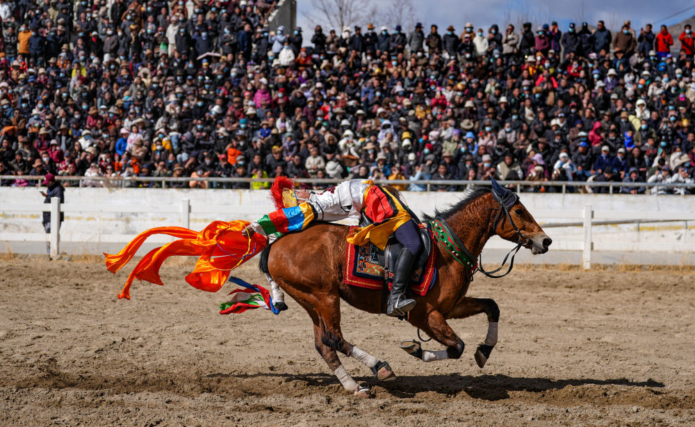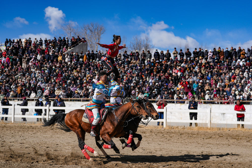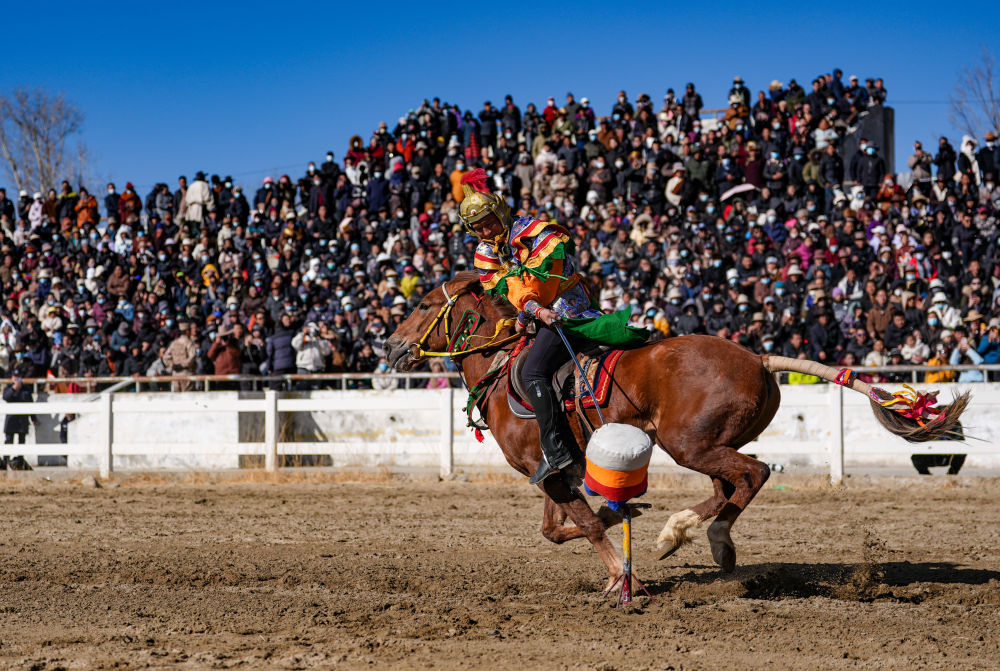 当日,2025年藏历新年初三民族传统马术表演暨民族赛马活动在拉萨市北郊赛马场举行。马术在西藏是吉祥、勇敢和智慧的象征。骑手们用精彩表演为观众送上新年的祝福。