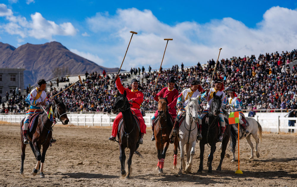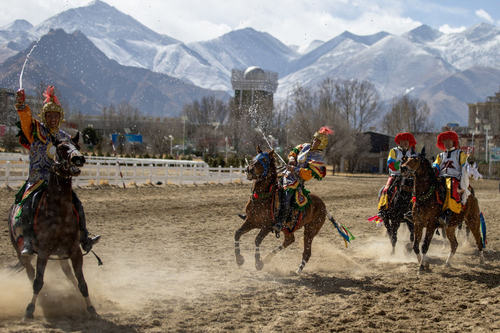 3月2日,马术队员在重现马球比赛场景。新华社记者 晋美多吉 摄