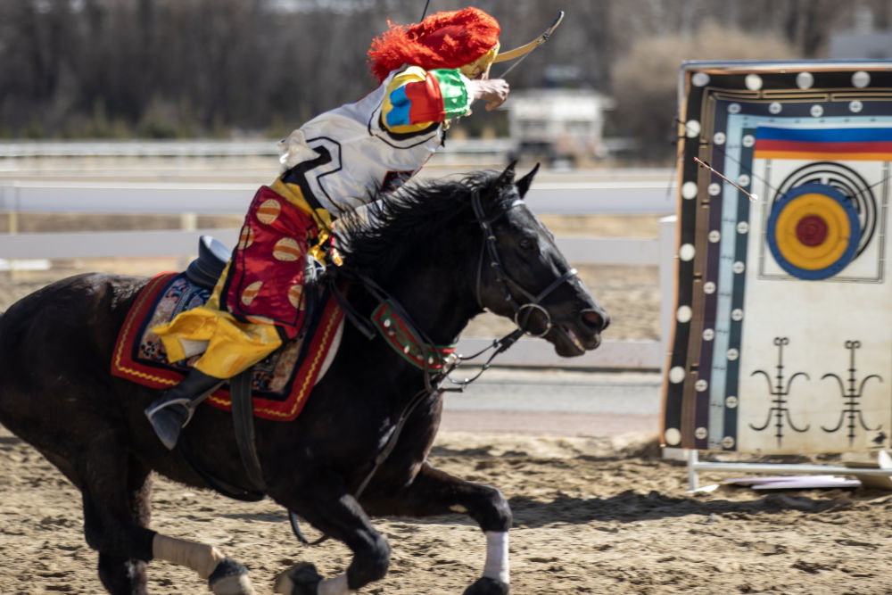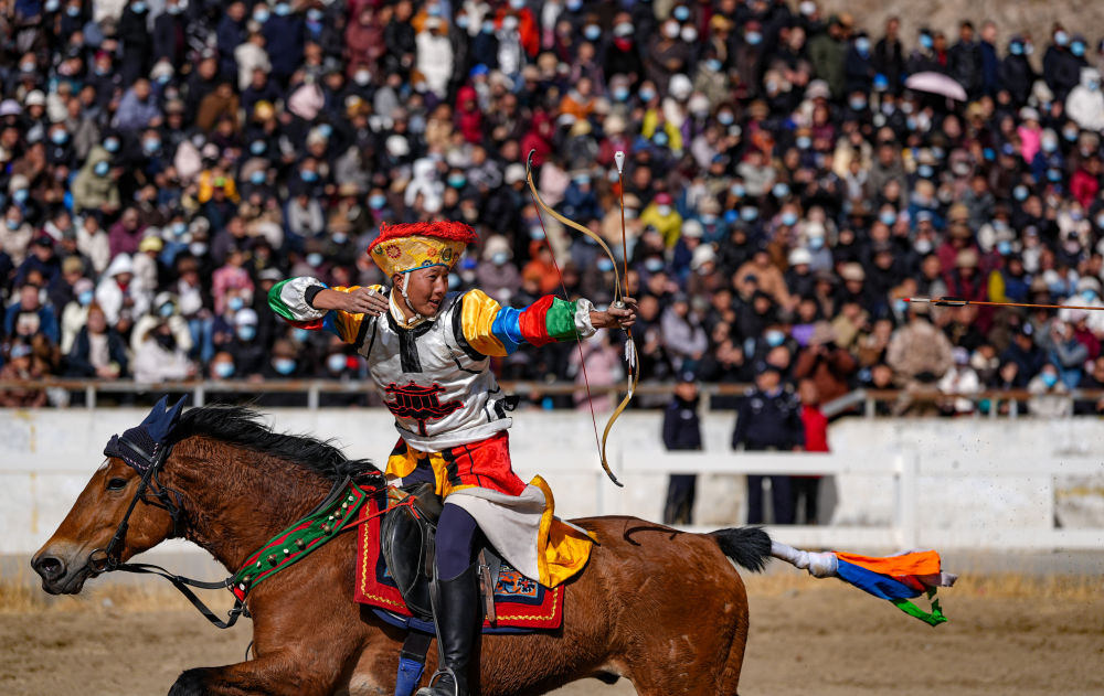 3月2日,马术队员在表演传统马术项目马上射箭。新华社记者 晋美多吉 摄
