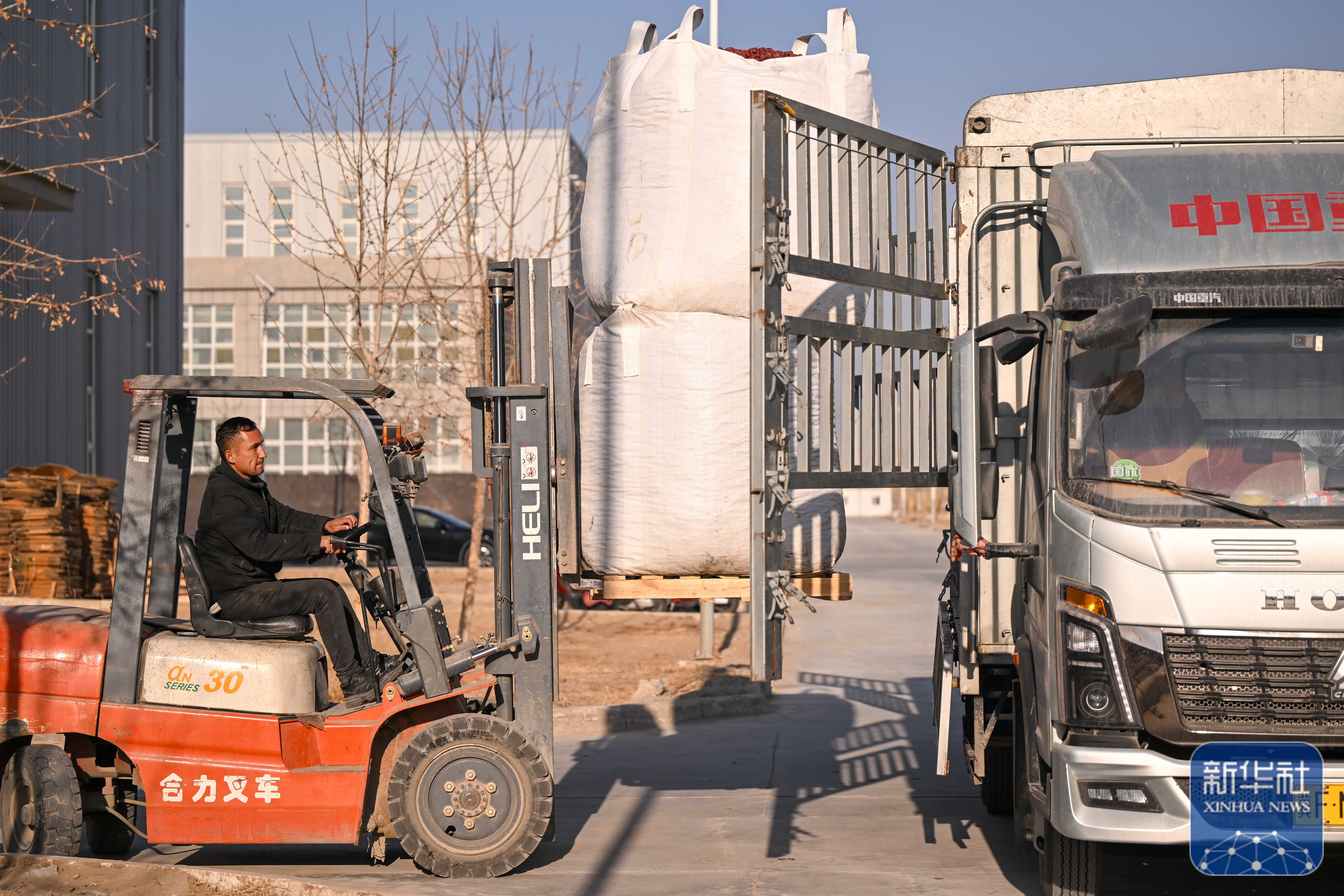 ↑ 在新疆和田地区墨玉县,和田源疆食品有限公司的工作人员将红枣装车准备运往河北(1月9日摄)。