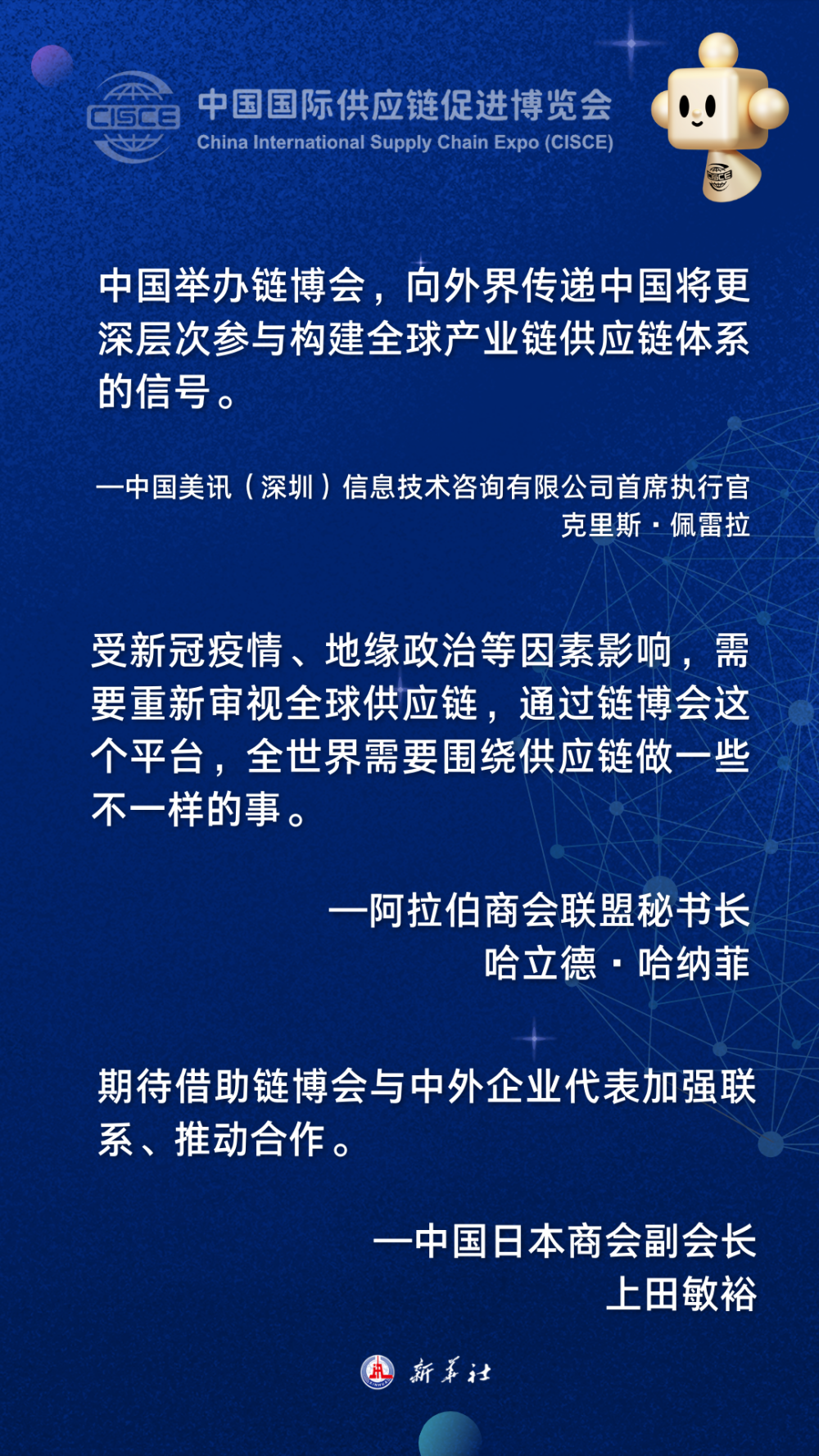 新华社北京11月30日电 首届中国国际供应链促进博览会11月28日至12月2日在北京举行。作为全球首个以供应链为主题的国家级展会,链博会集贸易促进、投资合作、创新集聚、学习交流功能于一体。与会多国人士表示,链博会的举办展现了中国维护全球产业链供应链安全稳定的担当,期待借助这一平台巩固和加强全球产业链供应链合作,助力世界经济复苏。