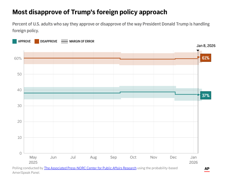 美联社近日刊文称,美联社-NORC公共事务研究中心最新民意调查显示,56%的美国成年人认为,美国政府在动用军队干预他国的问题上“太过火”,同时多数人对美国政府的整体外交政策及在委内瑞拉问题上的处理方式持否定态度。