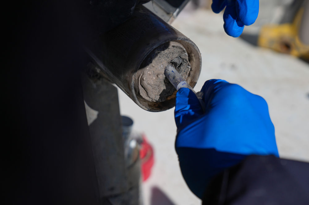 7月11日,钻探工作人员正在取出钻取的湖泊岩芯。新华社记者 晋美多吉 摄
