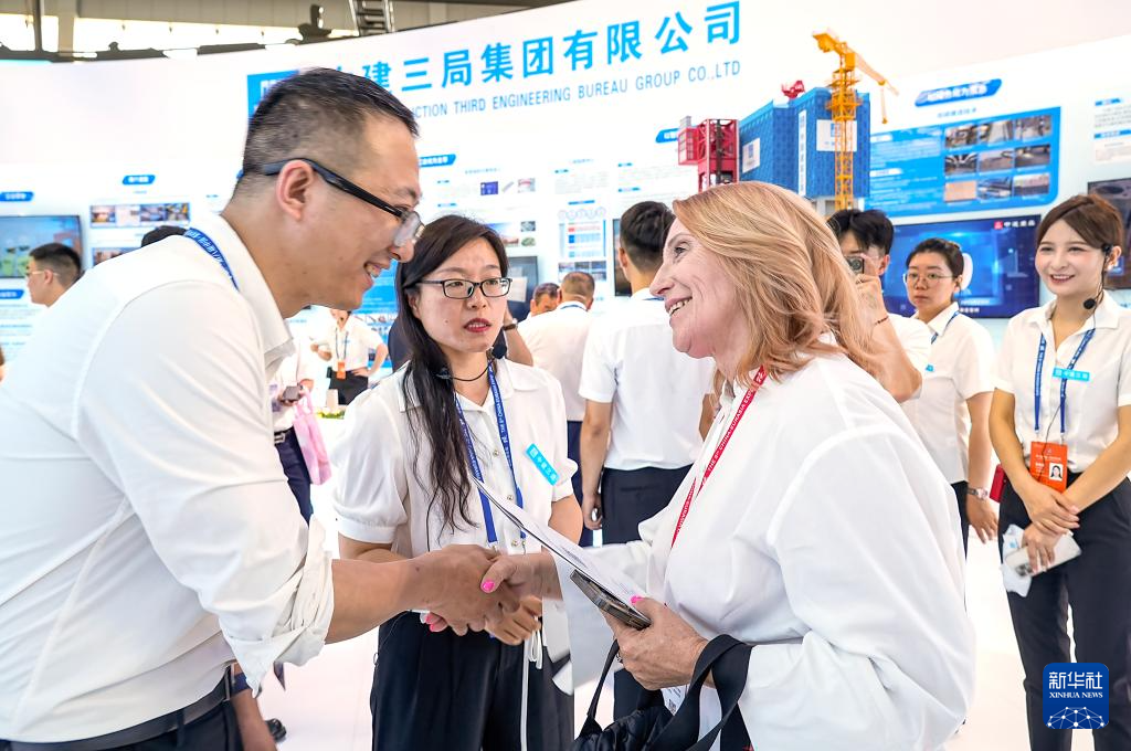2024年6月27日,在第八届中国—亚欧博览会上,吉尔吉斯斯坦企业客商(前右)与中建三局参展商初步达成协议。新华社记者 王菲 摄