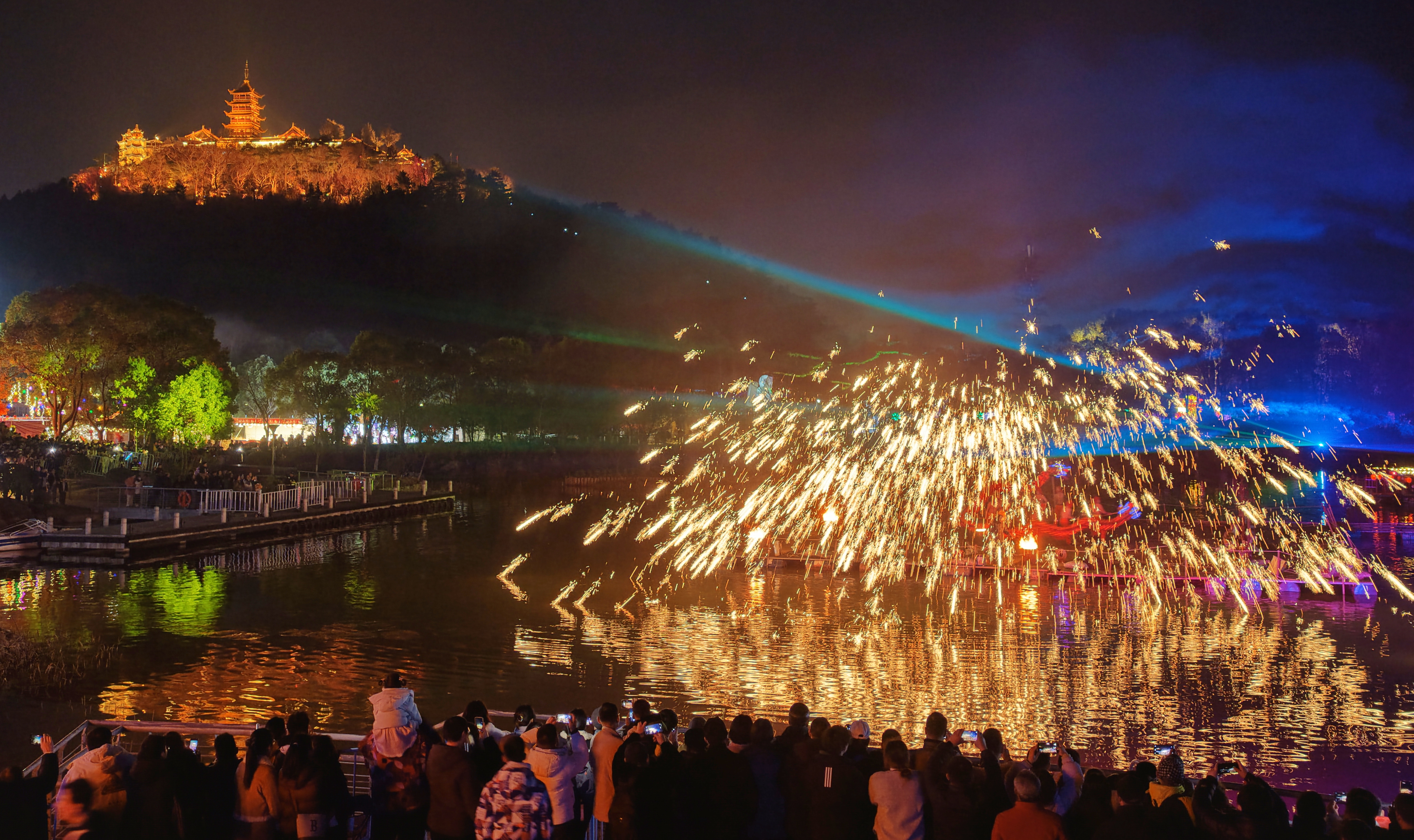 ↑ 2月14日,游客在江苏南通狼山新春灯会上欣赏打铁花表演(无人机照片)。新华社发(许丛军 摄)
