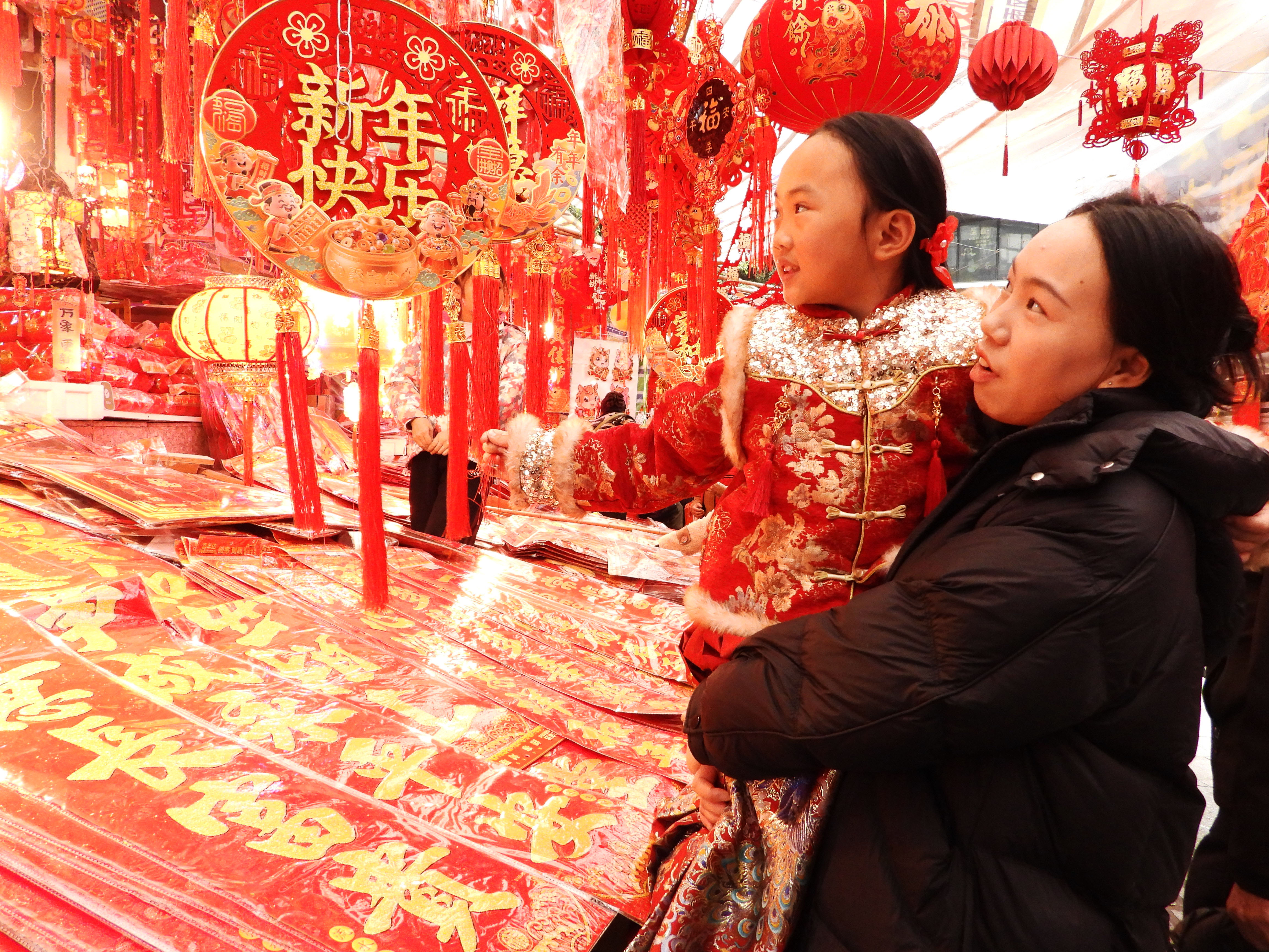 ↑ 2月15日,市民在四川省达州市通川区珠市街年货大集选购春节饰品。新华社发(邓良奎 摄)