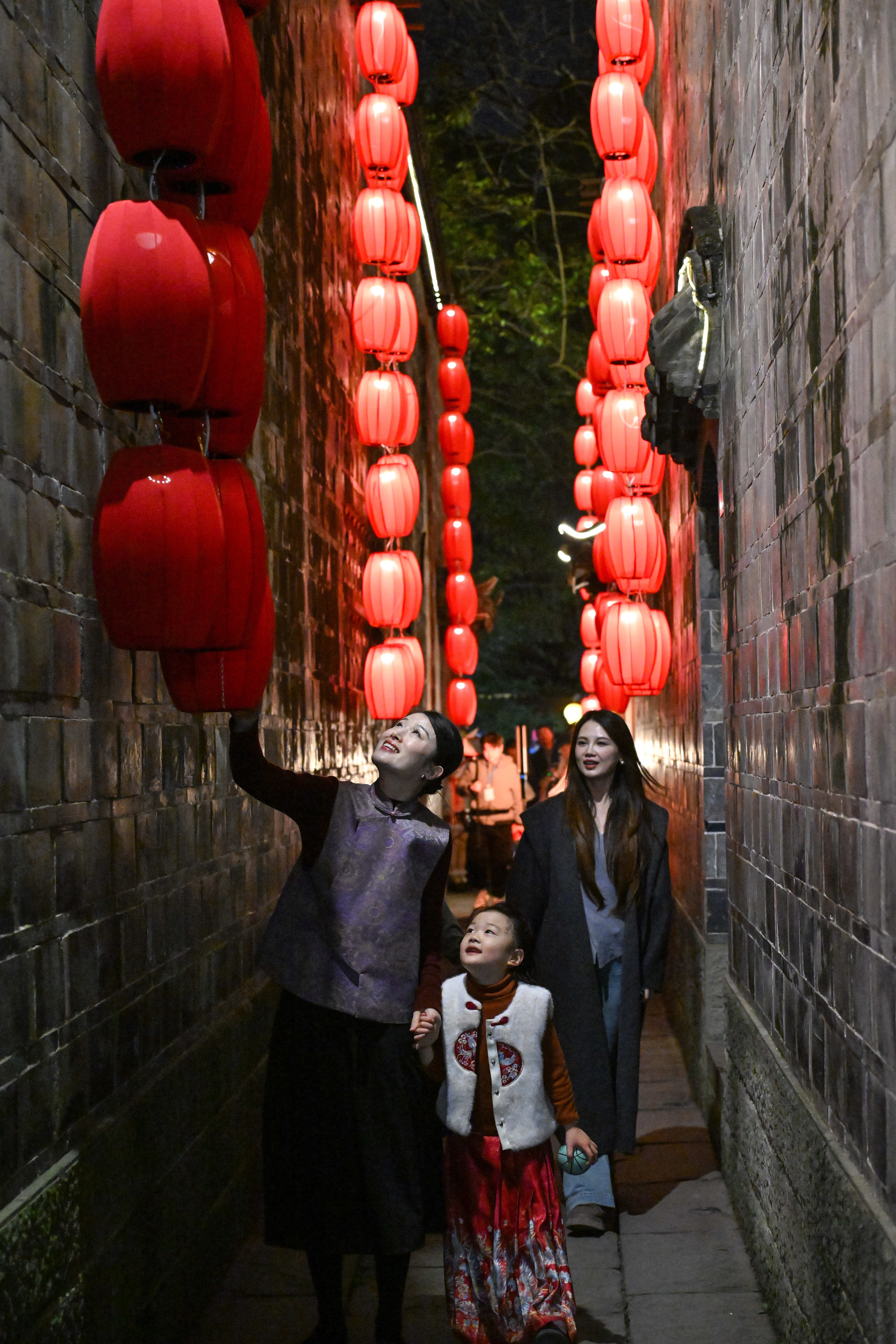 ↑ 2月14日,人们在浙江衢州古城文化旅游区水亭门历史文化街区赏灯游玩。新华社发(谢丹摄)