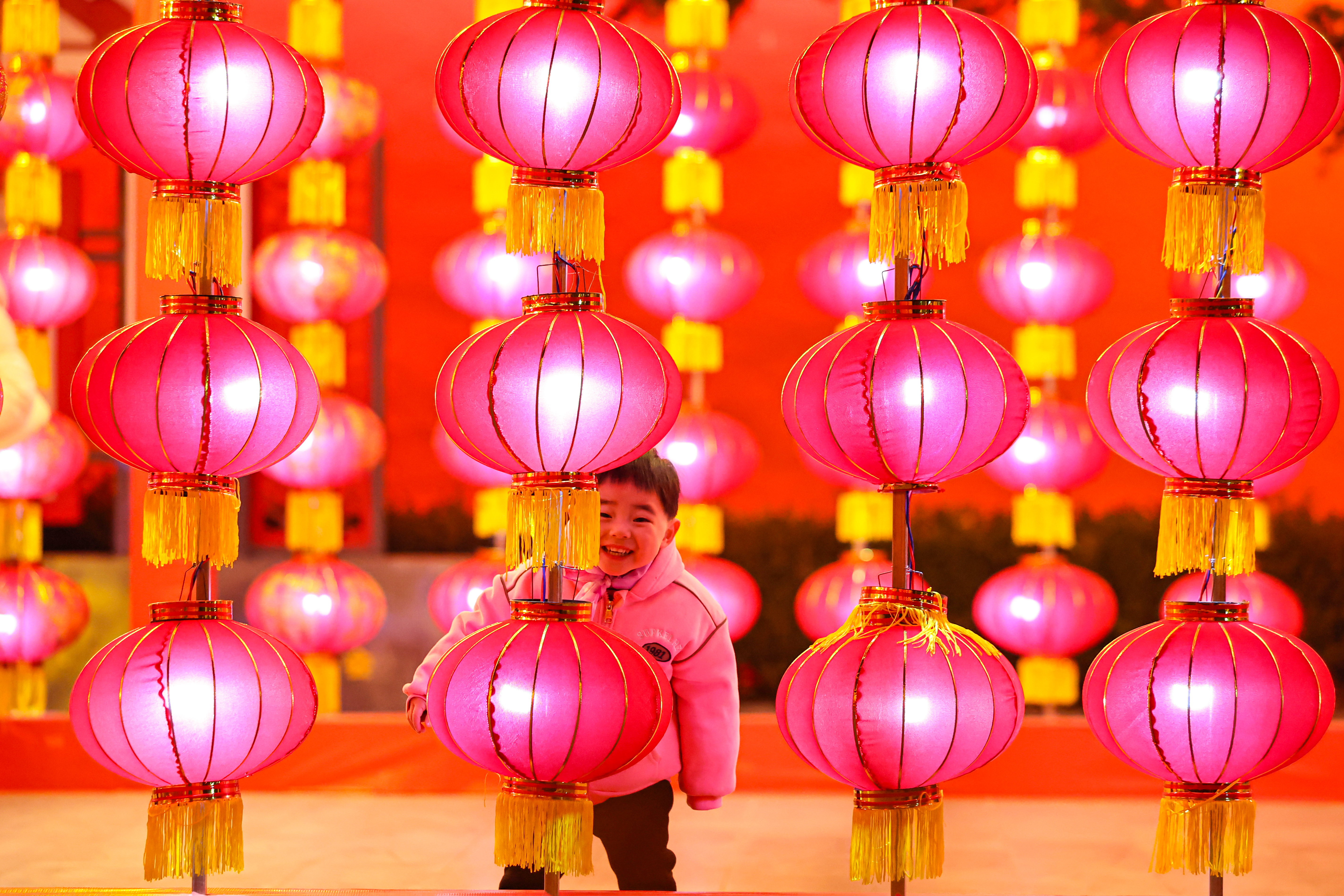 ↑ 2月14日,人们在湖北省武汉市武昌区一家购物中心红灯笼下玩耍。新华社发(赵军 摄)