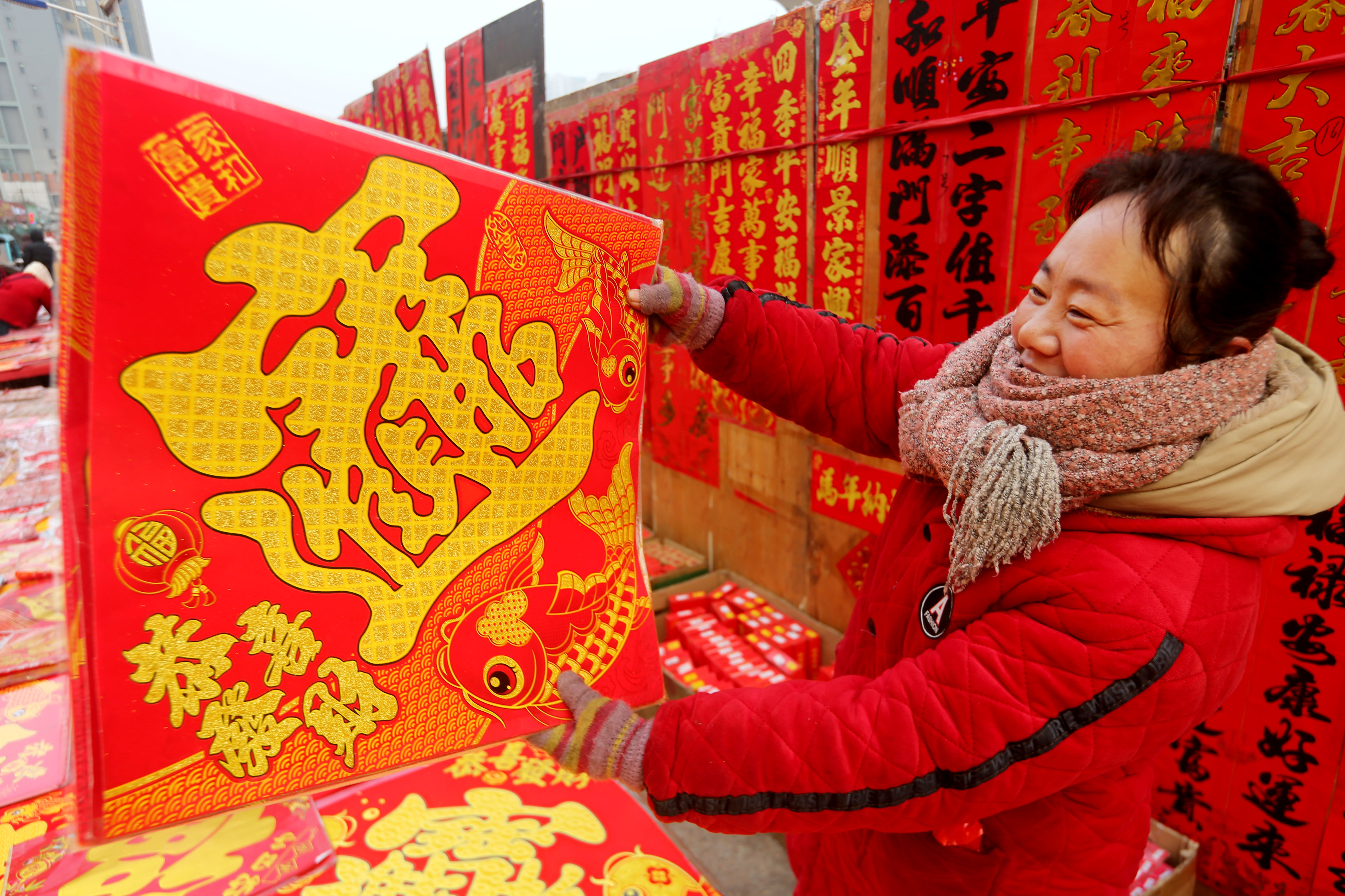↑ 2月14日,在河南省武陟县的一处年货市场,市民在选购新春饰品。新华社发(王琳锋 摄)