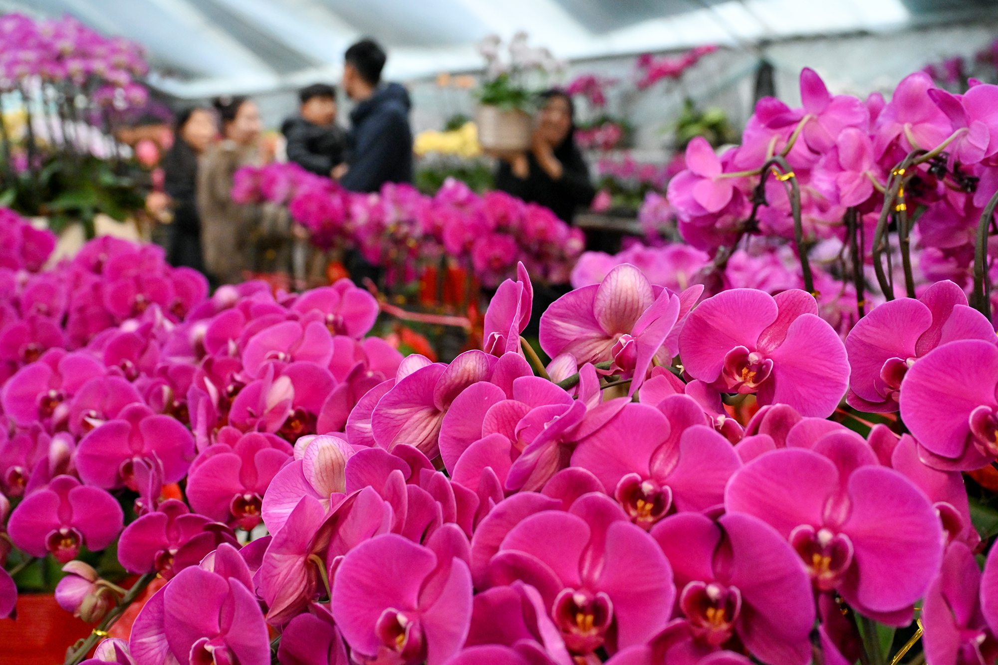 ↑ 2月15日,人们在河南省商丘市睢阳大道一处花卉市场选购鲜花。新华社发(李恒摄)