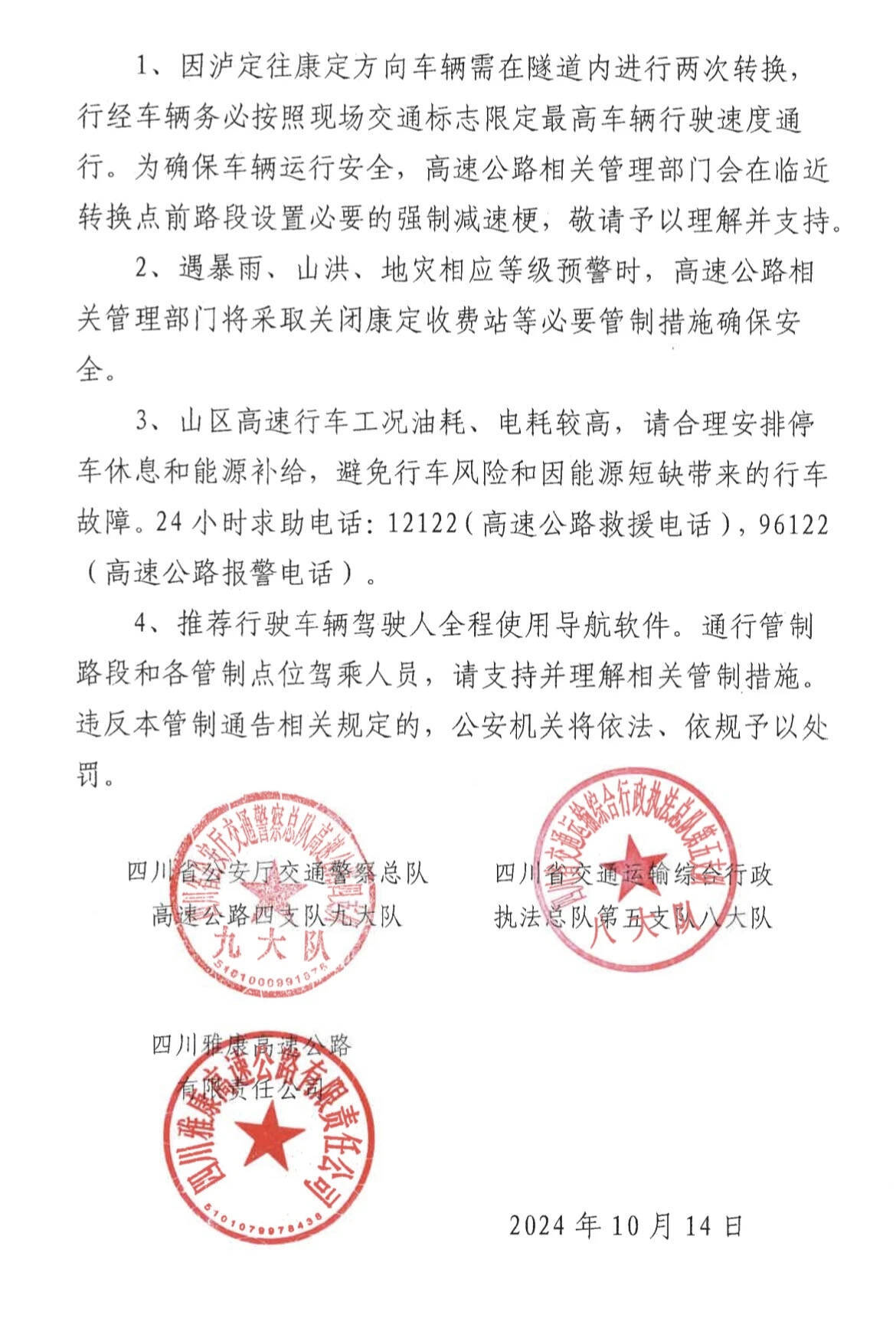10月14日晚,四川高速公安四分局发布关于G4218雅叶高速公路泸定至康定路段实施交通管制通告。管制措施包括:
