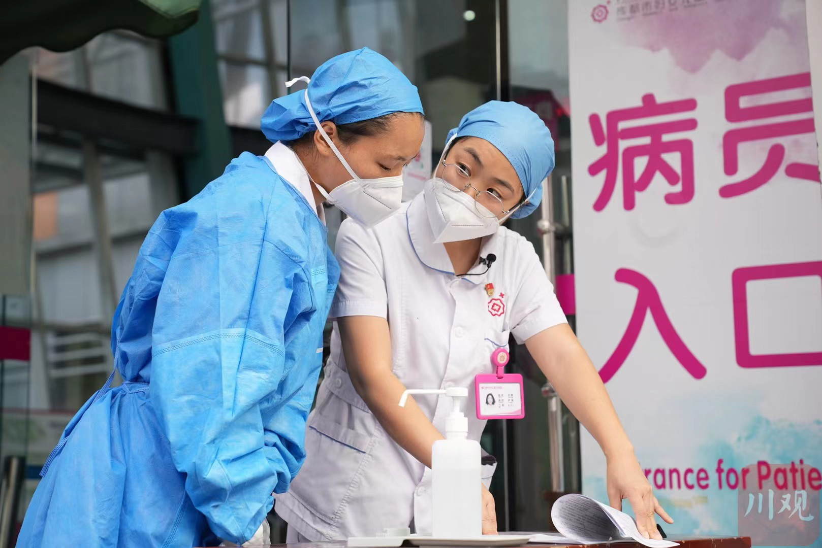 疫情虽已过去,但回想起抗疫的三年时光,向静仍记忆犹新,她和同事们一起并肩作战,克服困难。预检分诊是医院抗疫的第一道防线,是疫情防控的最前沿,这里也是人流量最大的地方。向静与同事们每天都需要在医院入口对每一位就诊患者进行初筛,测体温、扫码、查看健康码、行程卡及核酸检测报告,再根据不同的情况进行引导和处理。为了提升效率,向静和同事们想了很多办法,她们将记录着各地政策要求的“工作便利贴”贴在自己防护服袖口内侧,定期更新,这样值岗人员就可以很方便地判断患者及家属的情况并做出解释。
