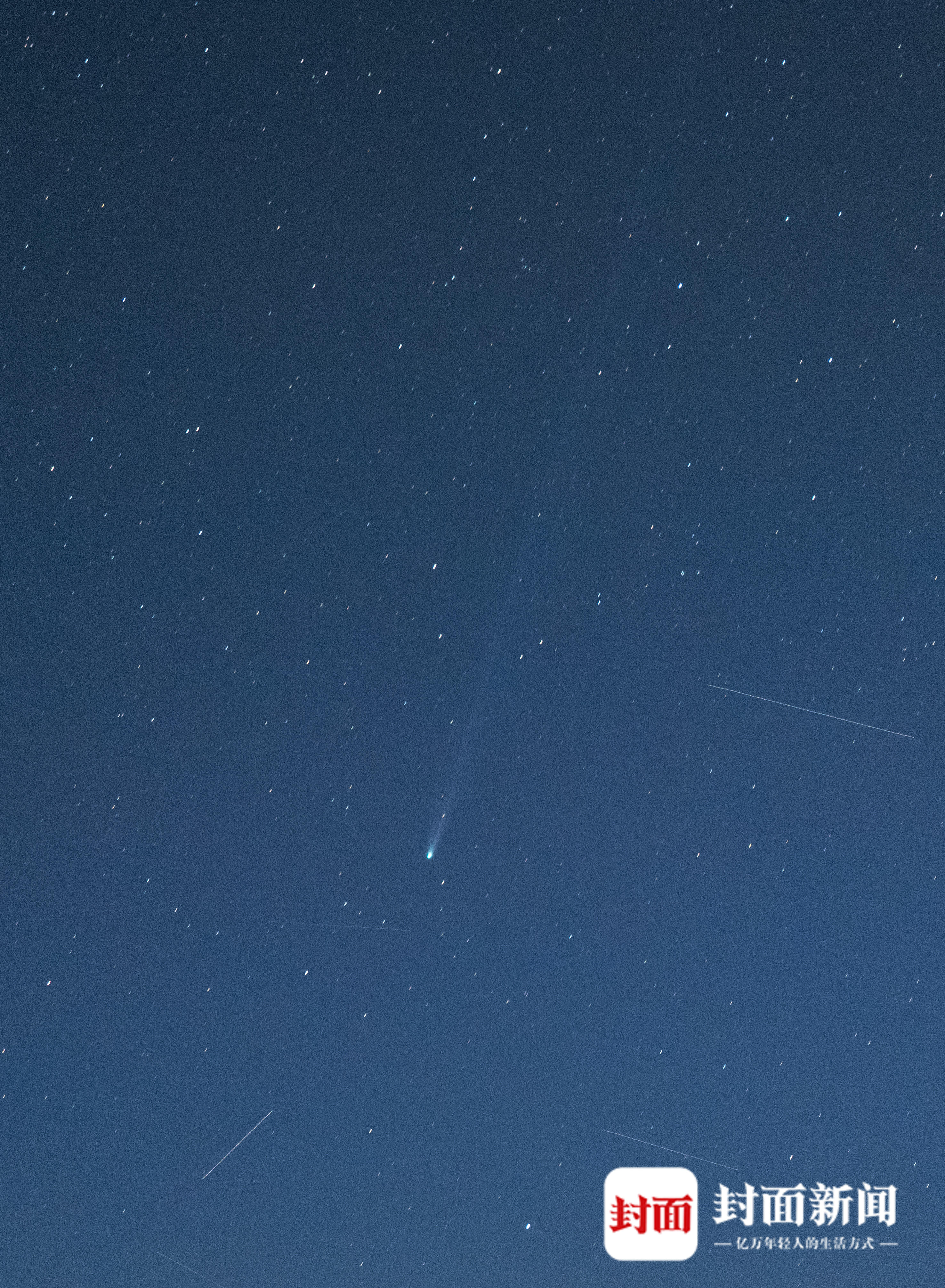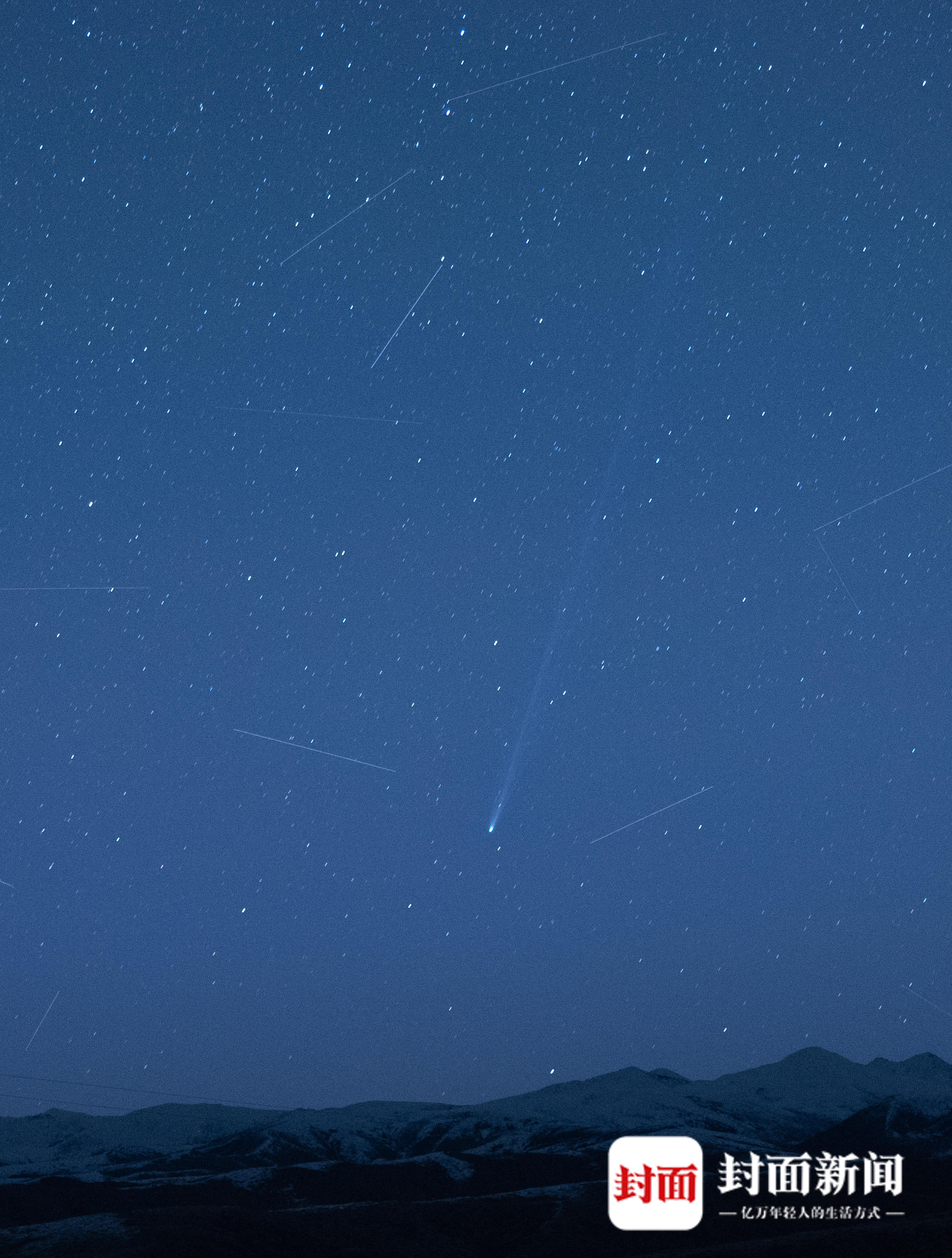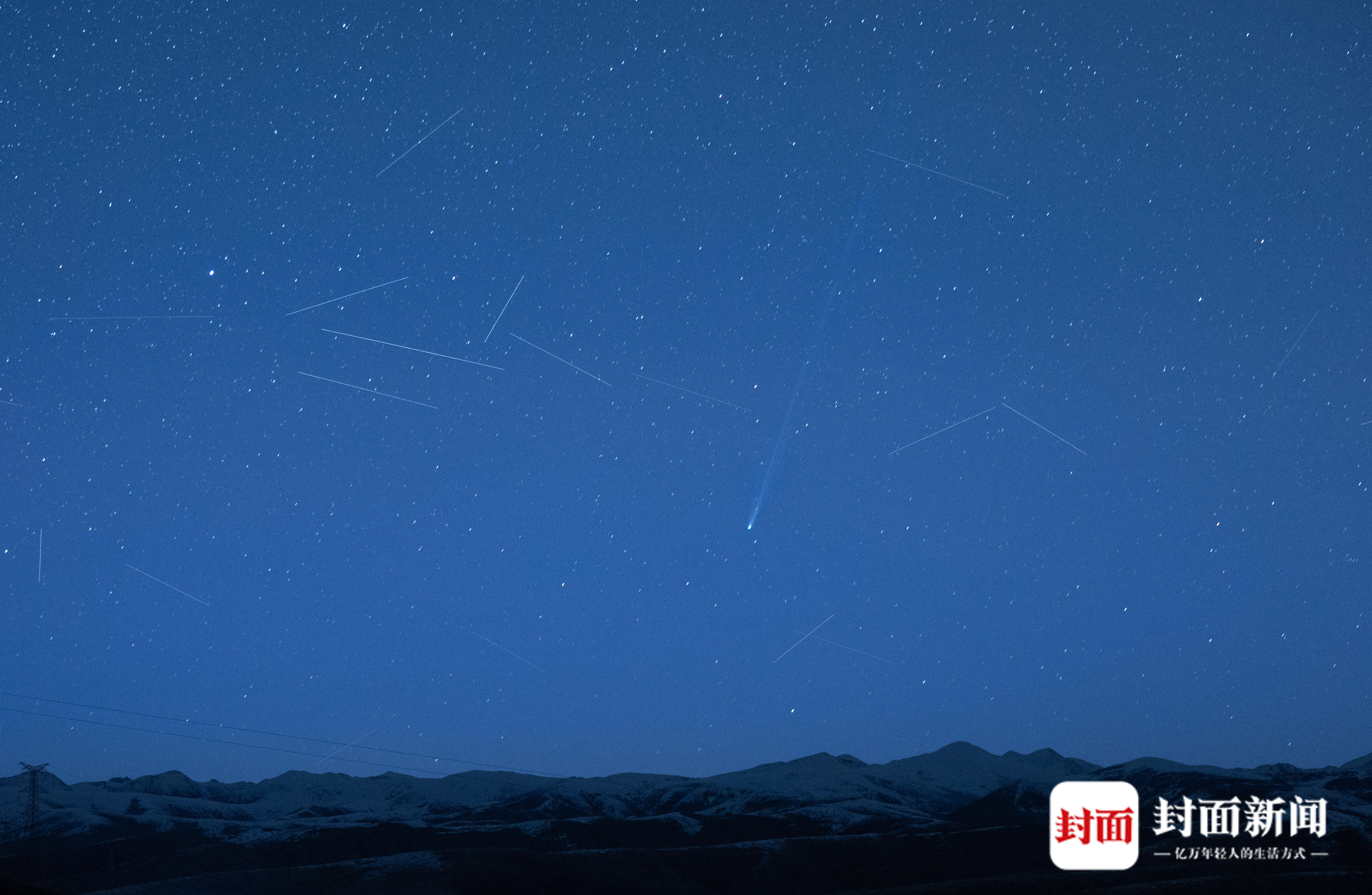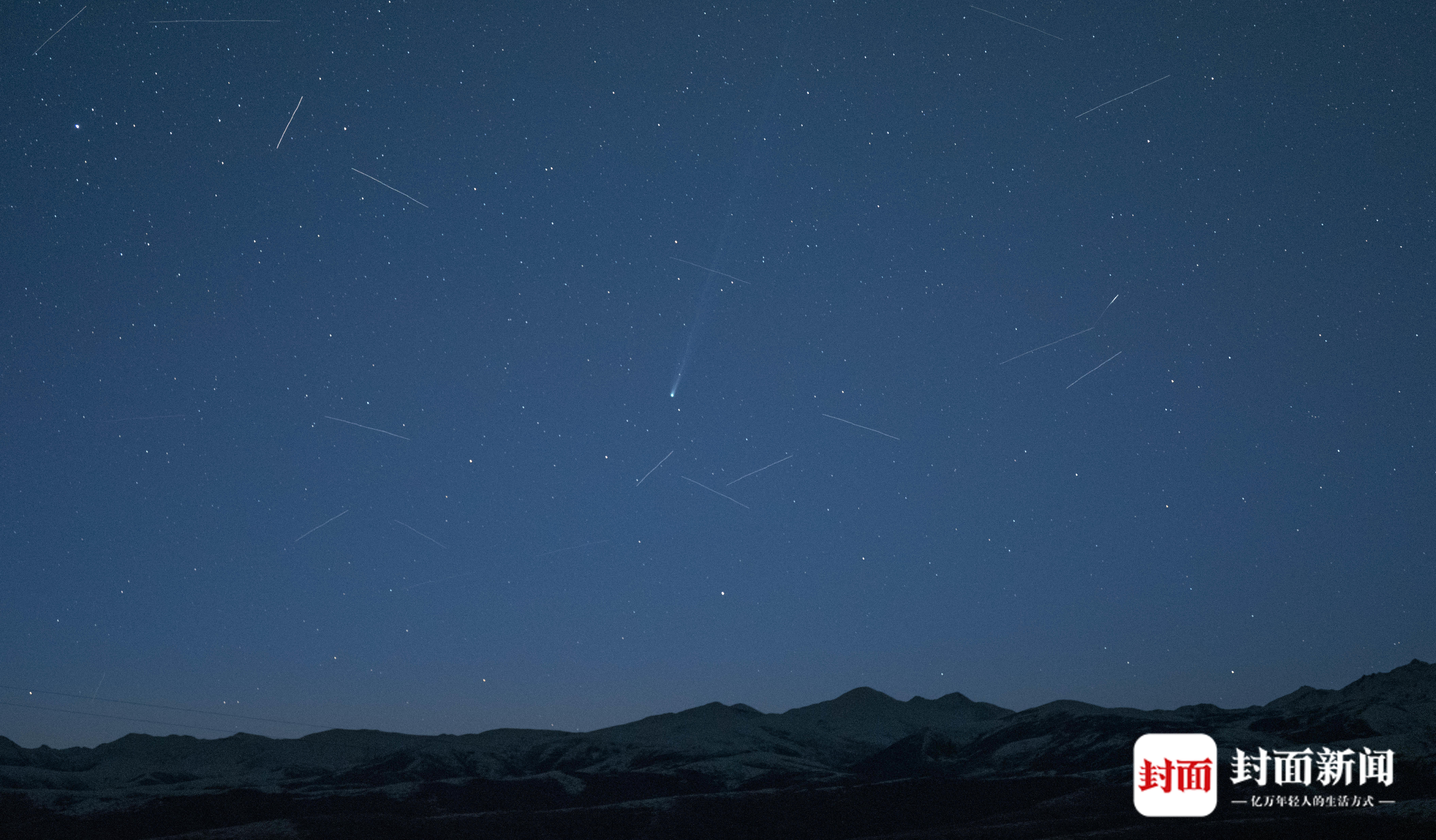 2026年4月18日清晨,海拔近4000米的四川省阿坝州红原县查针梁子上,C/2025 R3彗星拖着彗尾从东边升起,周围飞过的人造卫星像是在迎接它的到来。