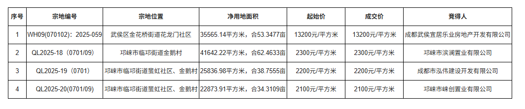 此外,今日成都还有四宗土地成功出让,分别位于武侯区和邛崃市,成交面积合计约188.7亩,均为低价成交。