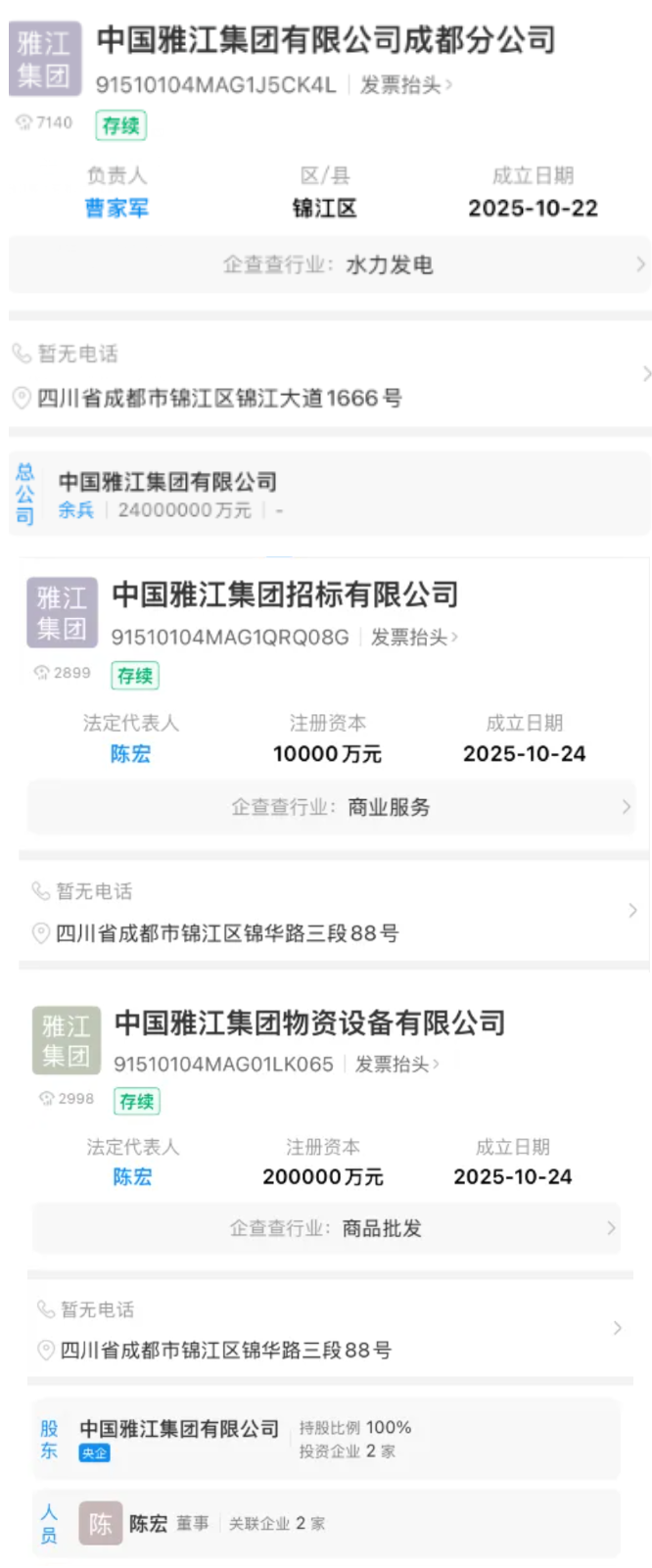 事实上,就在上个月,雅江集团已在成都注册成立三家子公司:中国雅江集团有限公司成都分公司、中国雅江集团物资设备有限公司和中国雅江集团招标有限公司,注册地址均位于锦江区。