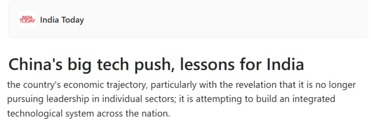 《今日印度》网站近日刊文称,中国近期通过的“十五五”规划纲要为下阶段发展指明了方向。其中引人注目的是,规划纲要不再追求在单一领域取得领先地位,而是试图构建全国一体化的技术体系。